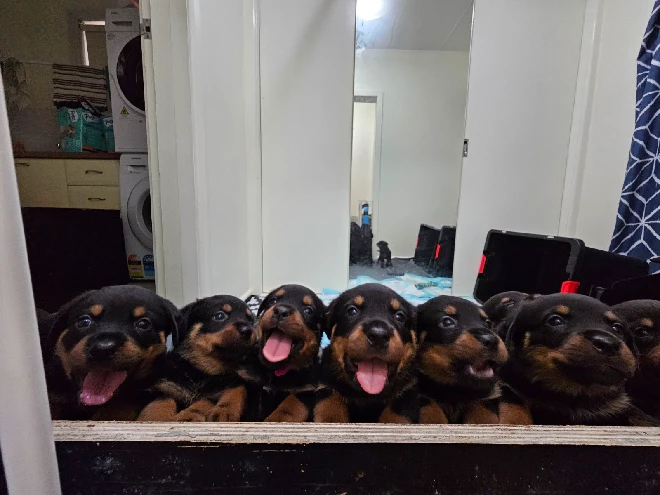 We have a large and healthy litter of Rottweiler puppies looking for loving homes. From the litter, there are currently 7 females and 5 males available, each with their own playful personality and strong build. These pups are developing beautifully and already showing the loyal and confident traits that the Rottweiler breed is known for.