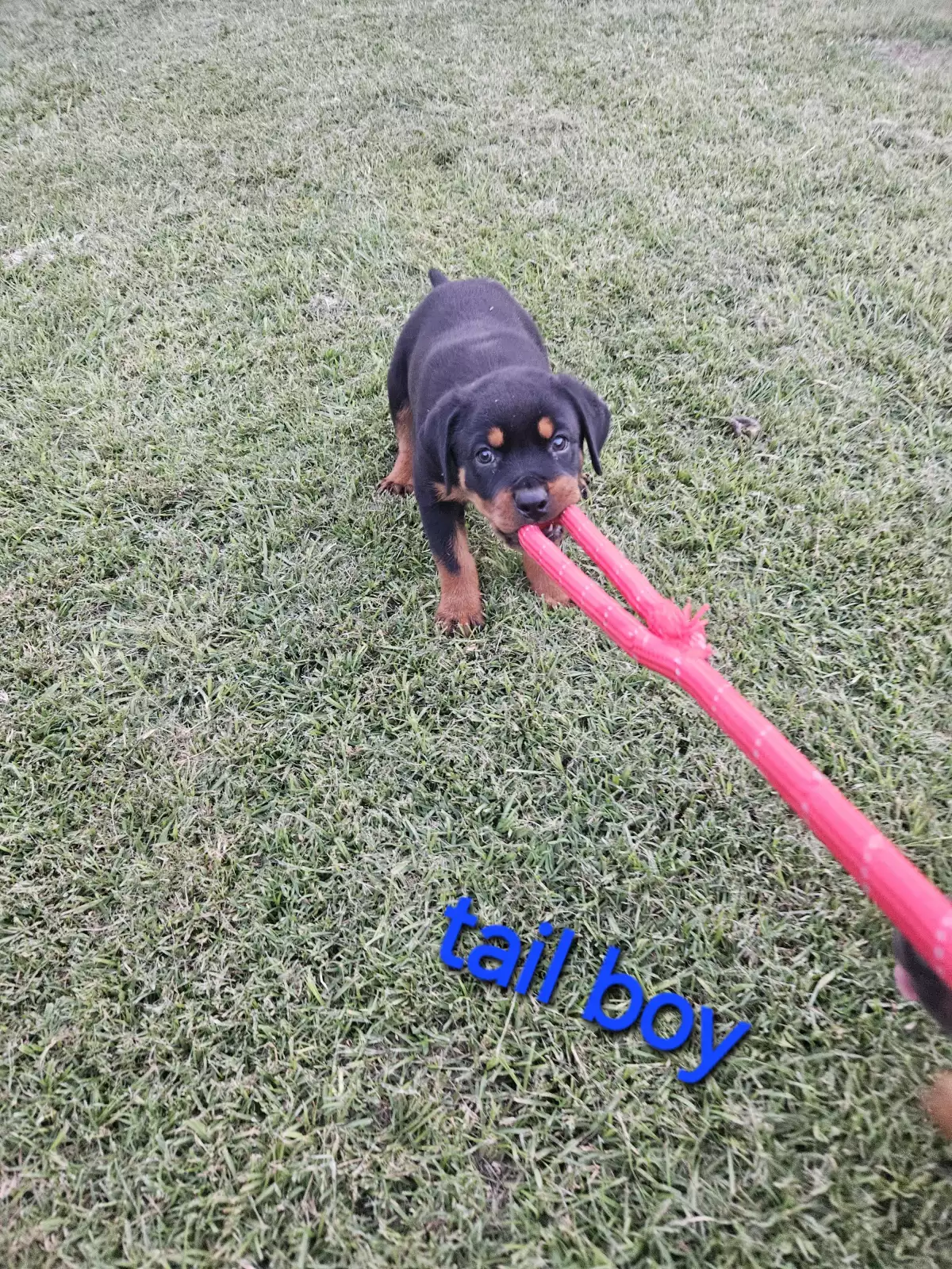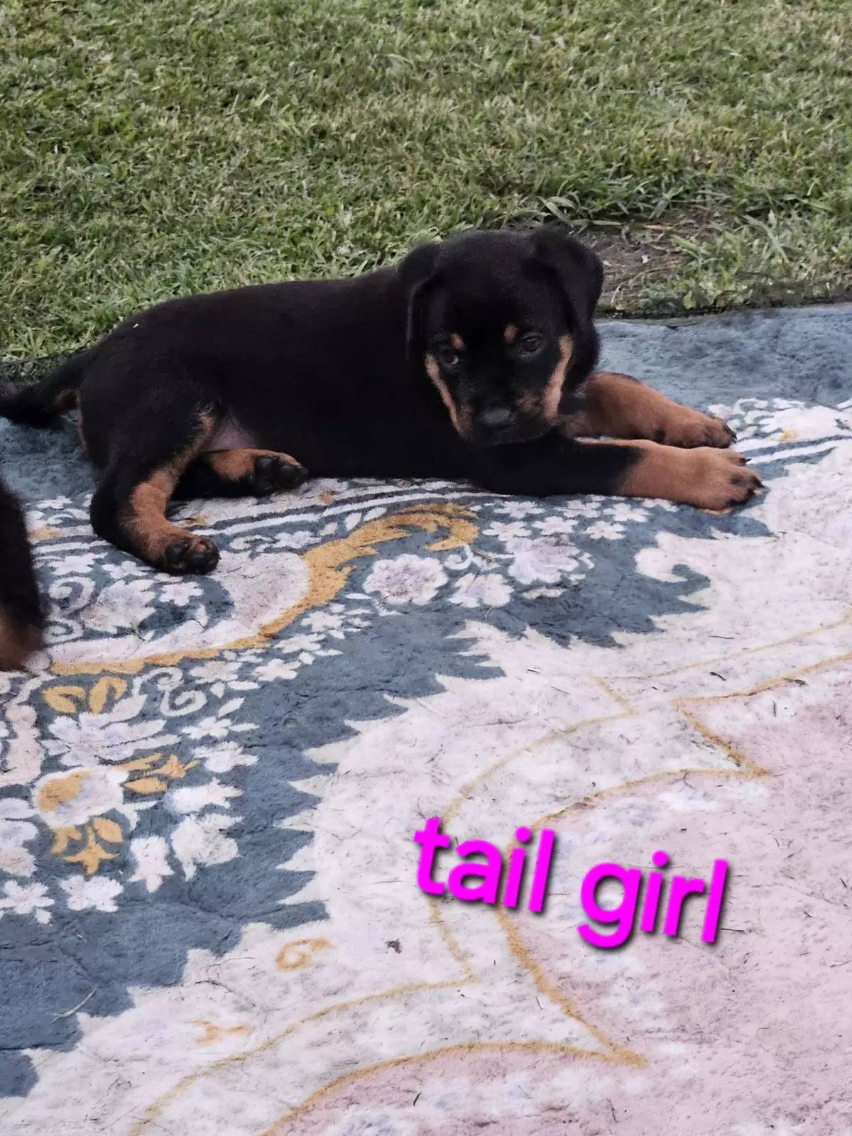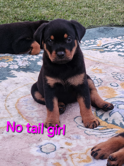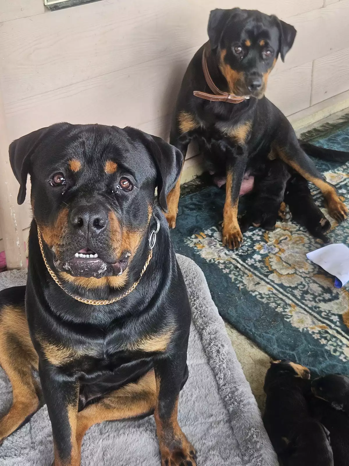 Mum is a tailed American/German Rottweiler, and Dad is a Roman bobtail Rottweiler. Both parents were raised by us from a young age after coming from different breeders, and they have wonderful temperaments. They are very loving with children and family members, while also being naturally protective as Rottweilers are known to be.
