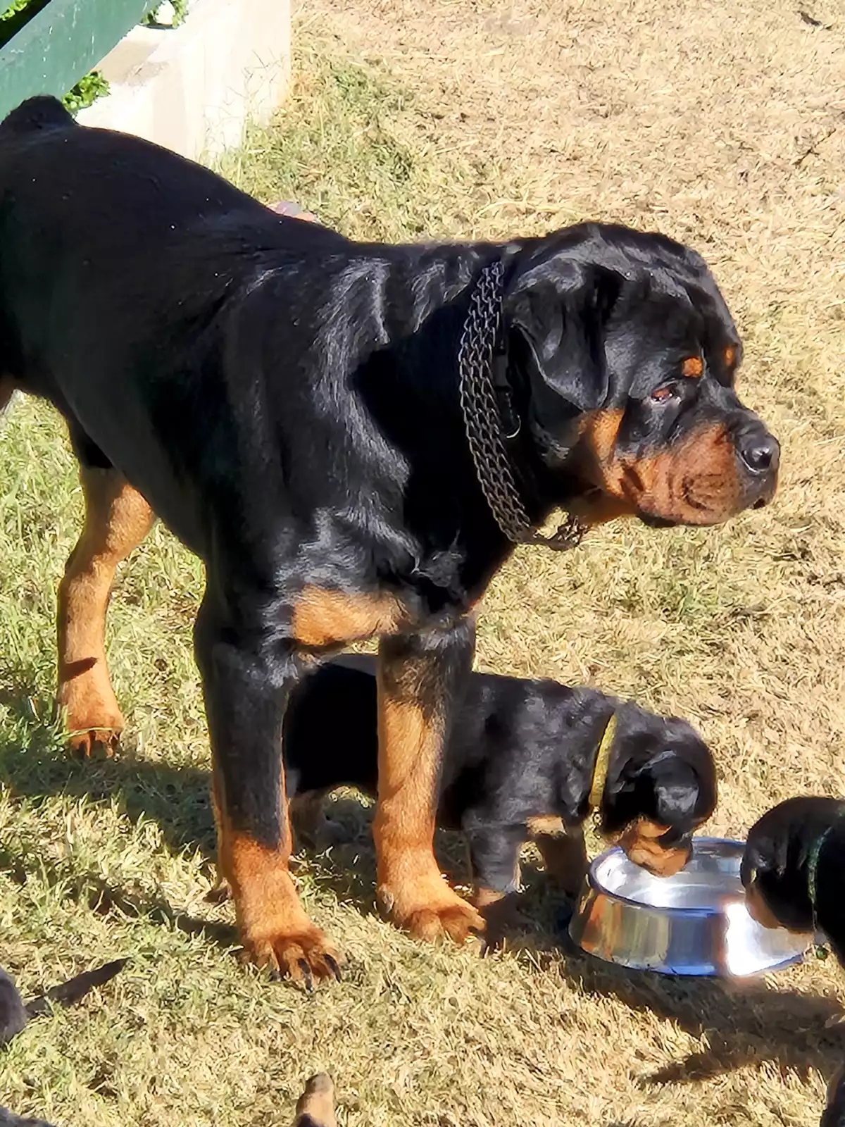 The puppies come from excellent bloodlines. Their father, SultanEmpire Scar, is a natural born bobtail Rottweiler with German pedigree, while their mother, Roxie, is a 3-year-old purebred American Rottweiler with a full tail. Both parents are strong, intelligent dogs with loving and protective temperaments and have no elbow or hip issues.
