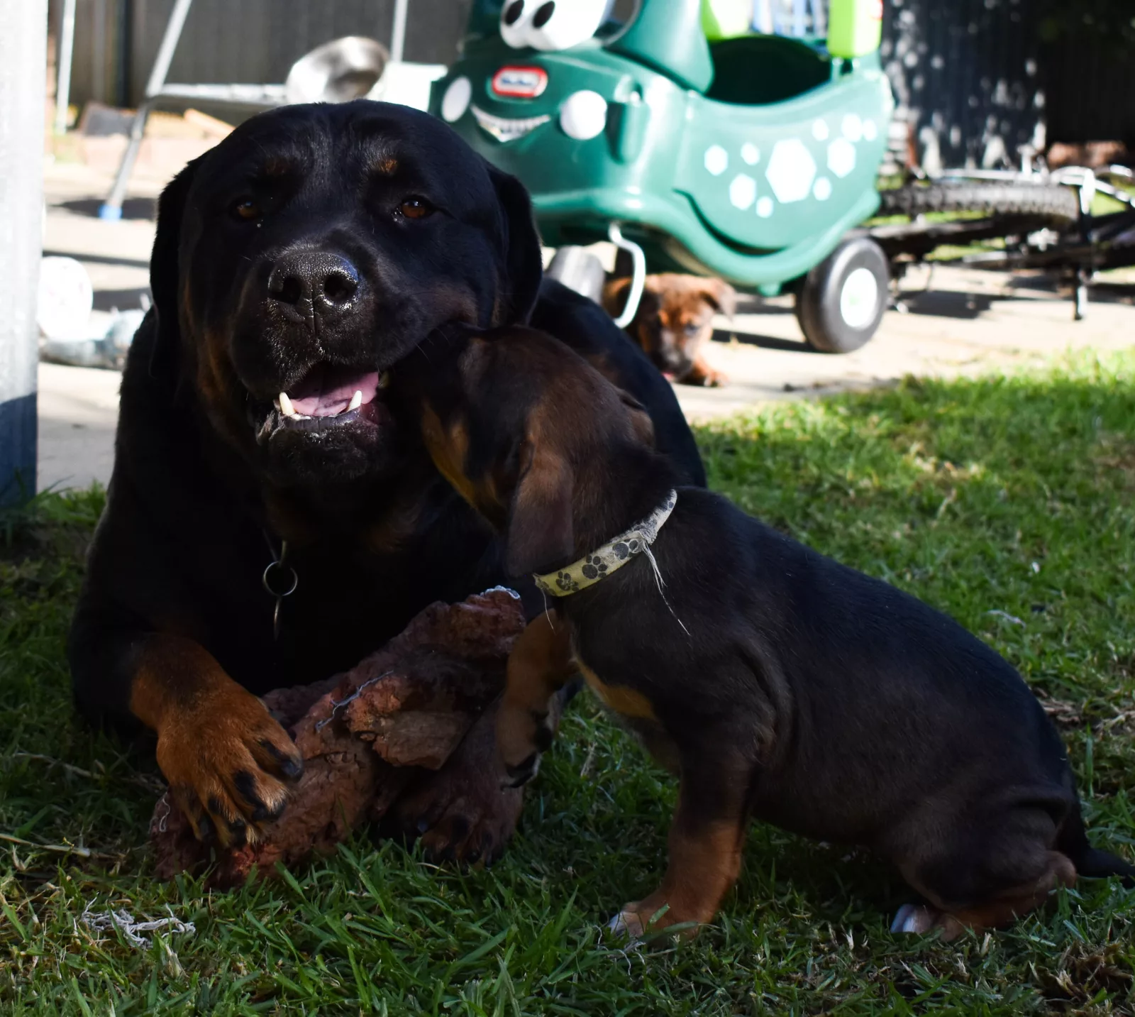 The puppies come from wonderful family dogs. Their dad is a Rottweiler and their mum is a Staffy cross Bulldog. Both parents are loving, playful and protective family pets with great temperaments. They have been raised around young children and are also comfortable around the family cat, showing their gentle and social nature.