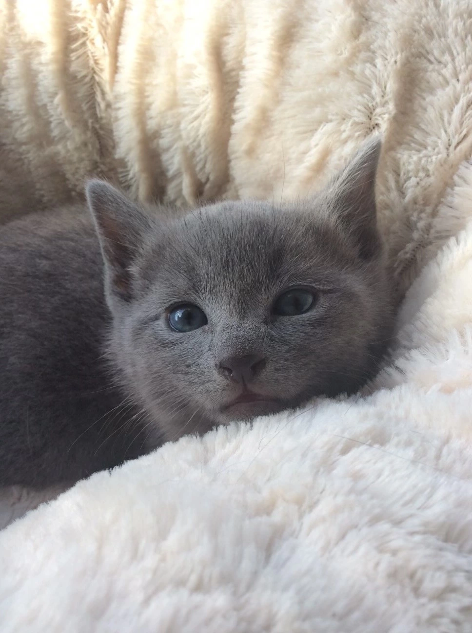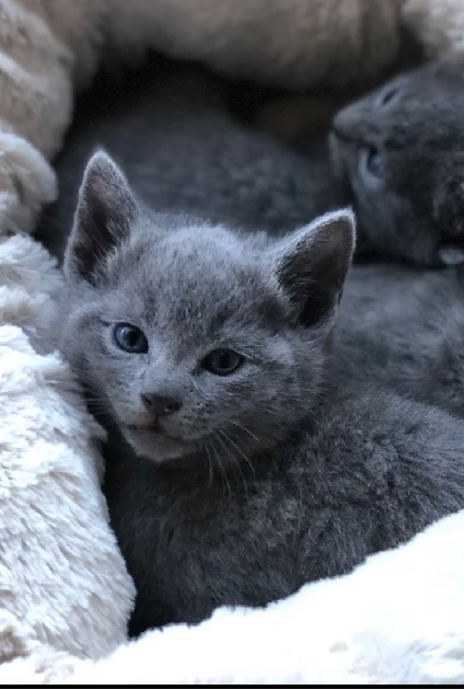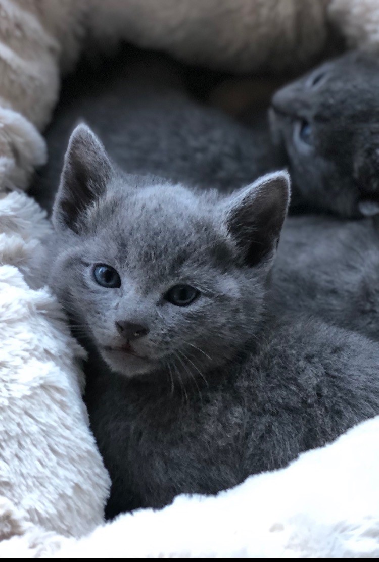 Russian Blues are a very unique breed with many desirable traits. They have short yet very soft bluish-silver tipped fur. Russian Blue kittens have beautiful bright sapphire blue eyes at birth. As they age their eyes go through a majestic transformation, turning from a greyish blue to a bright emerald green, becoming more vivid with age (reaching full potential around 18 months of age). Their permanent smile reminds me of a child that's up to no good. By nature, the breed is calm, loving, easy going & quiet. With their affection, loyalty & demeanour, I can confidently say, they are more like dogs in cat suits compared to many other breeds. My kings & queens also enjoy a nice game of fetch.
