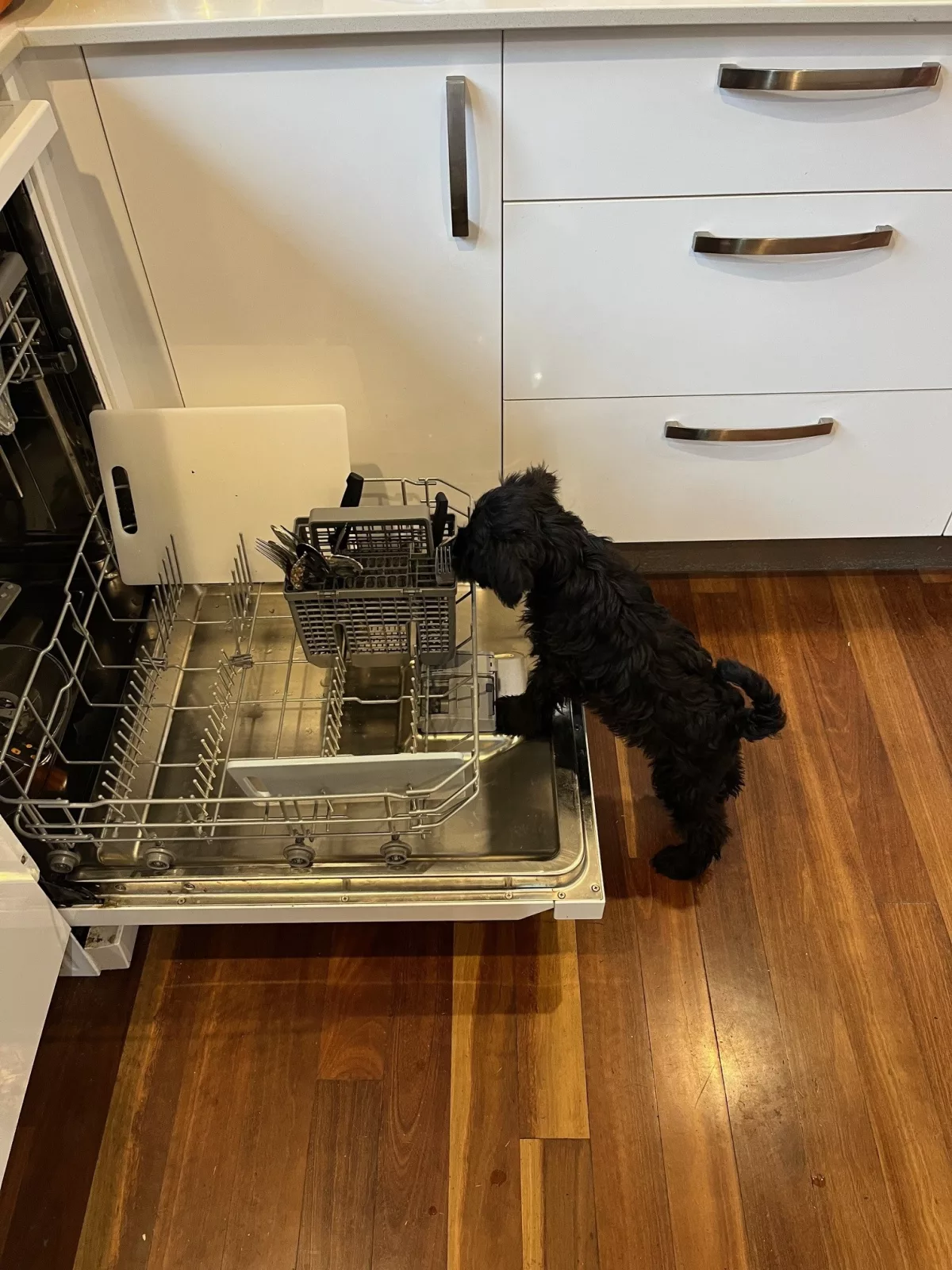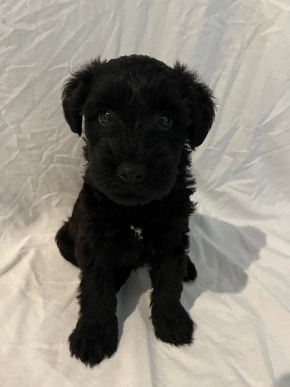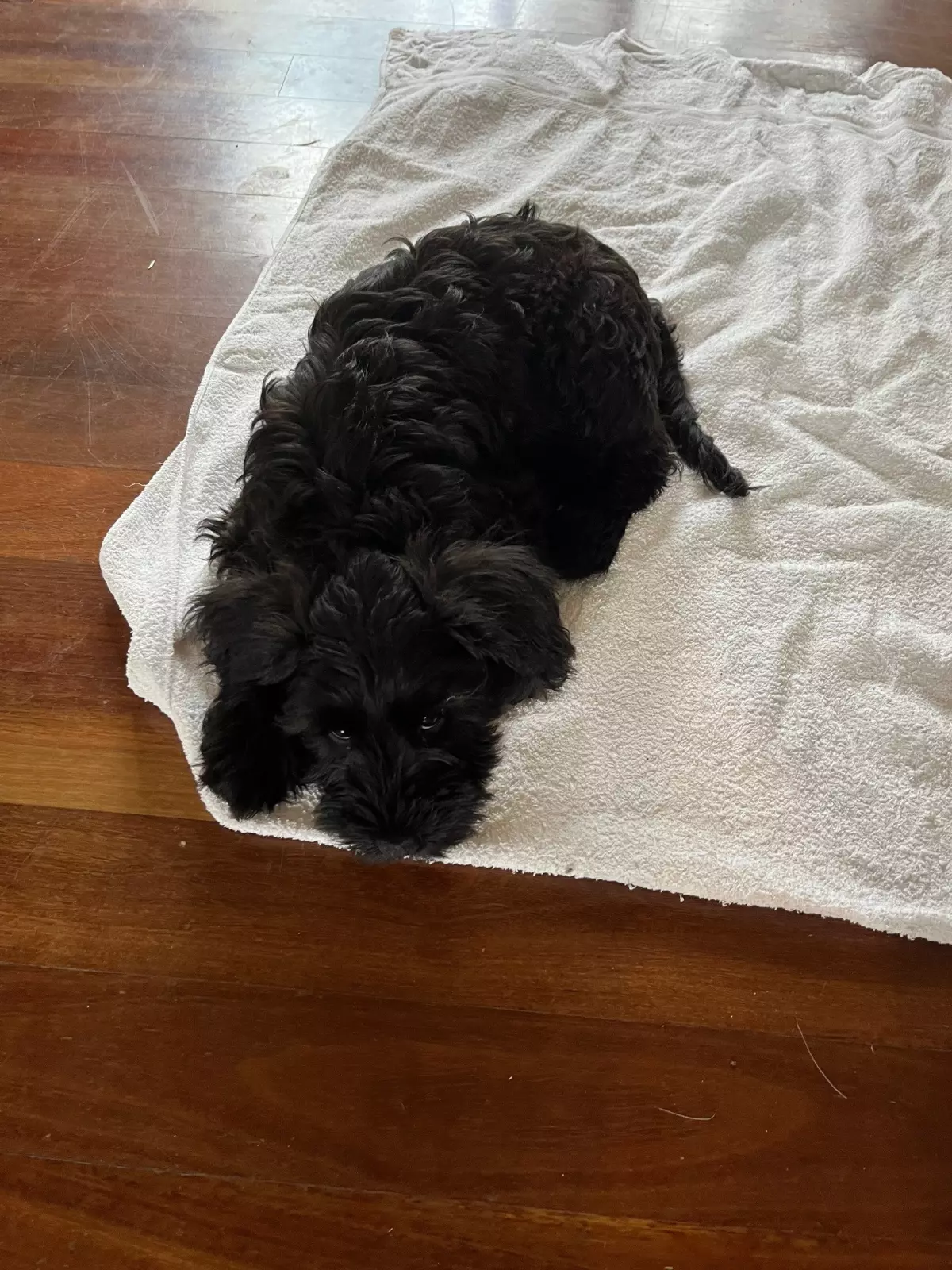 The mum (Millie) is an all-black schnoodle (half miniature poodle, half miniature schnauzer). She gave birth to 8 puppies naturally on 20 July and is an excellent mum (her 3rd and final litter). She weighs 7 kg. Has a lovely quiet nature, loves cuddles, and is a very smart dog.