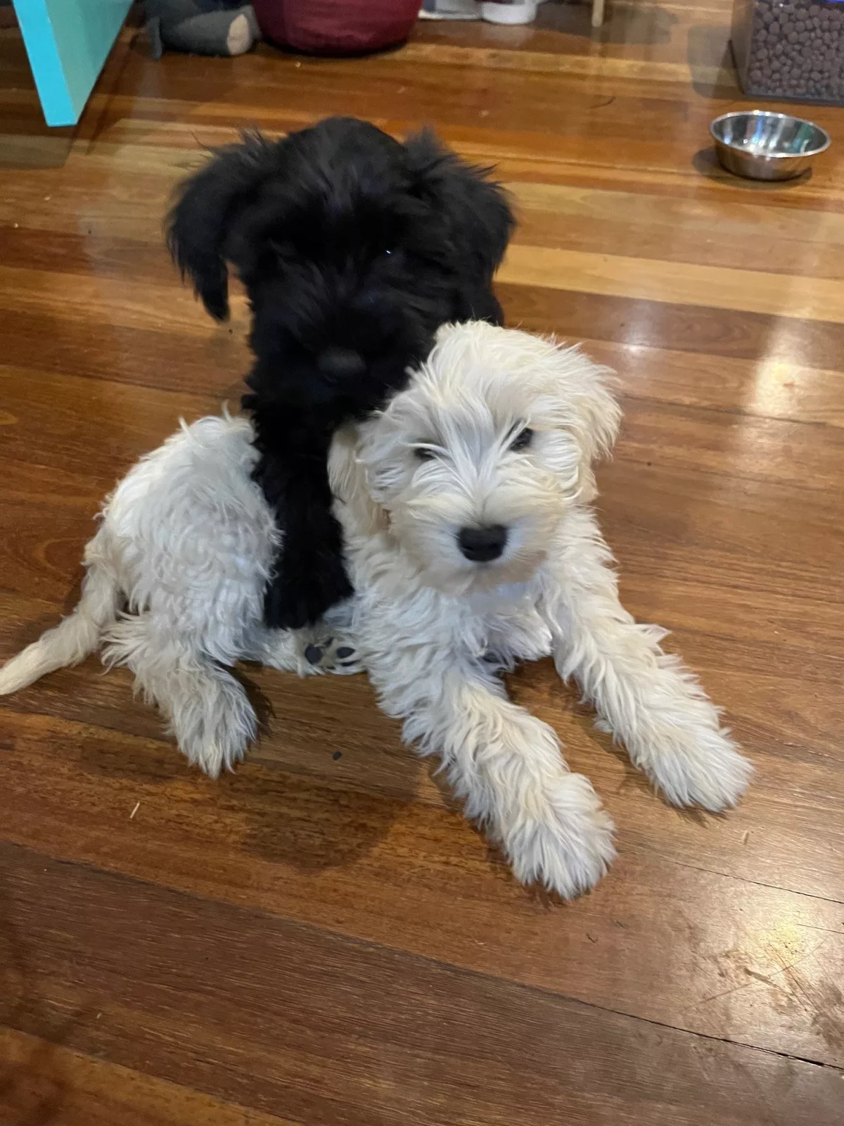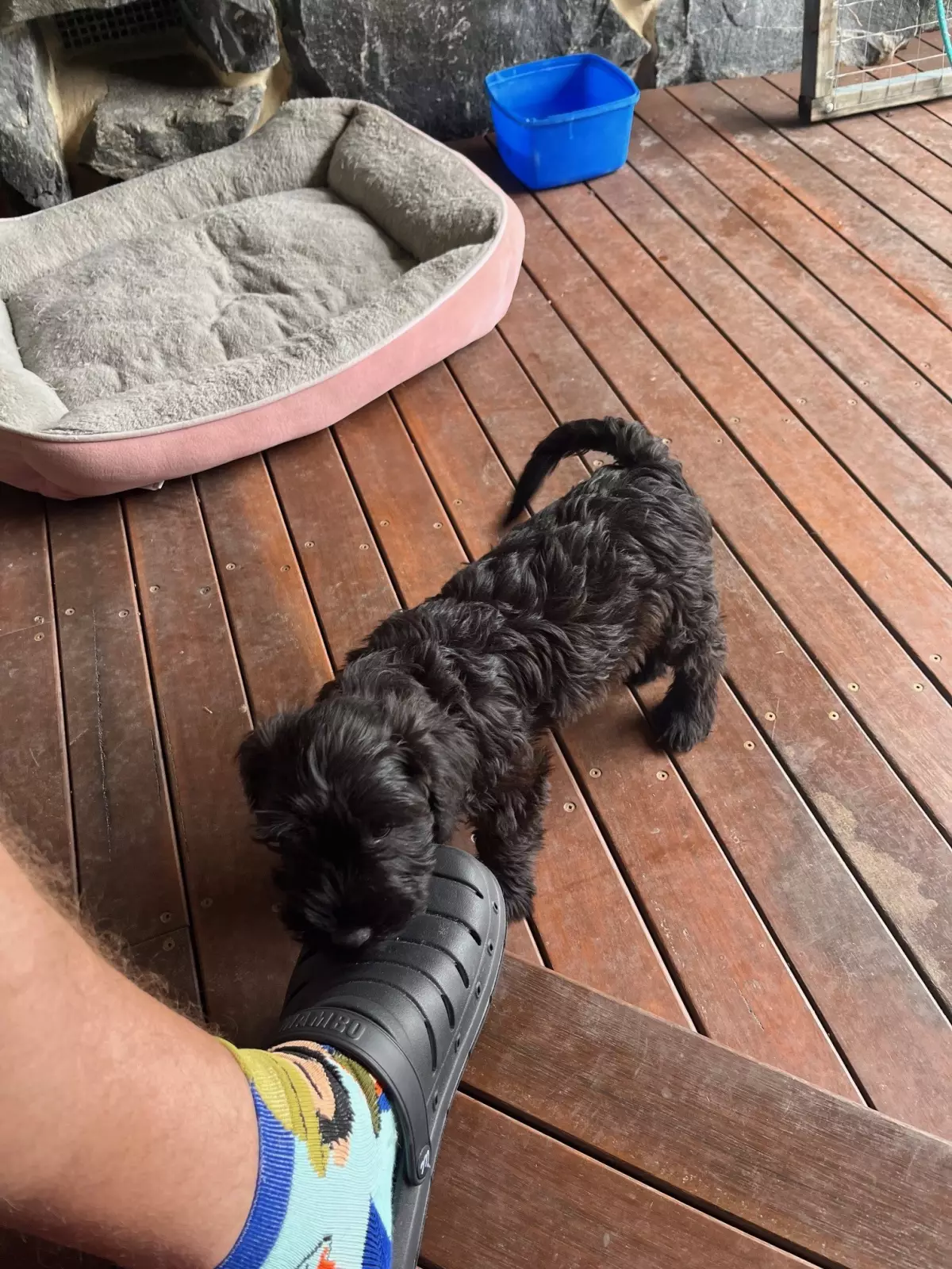 Colourful Schnoodle (mini-Poodle x mini-Schnauzer) pups looking for loving homes. Schnoodles are a fun loving and smart family dog that are hypoallergenic and non-shedding. Pups will come microchipped, immunised (1st) and wormed (at week 2,4,6,8). They will also be vet checked and come with some food that they are used to eating. The puppies have been brought up in our family home with lots of love and interaction with cat, goat, lizard and our children. They have grown up inside the house but have had lots of adventures outside.