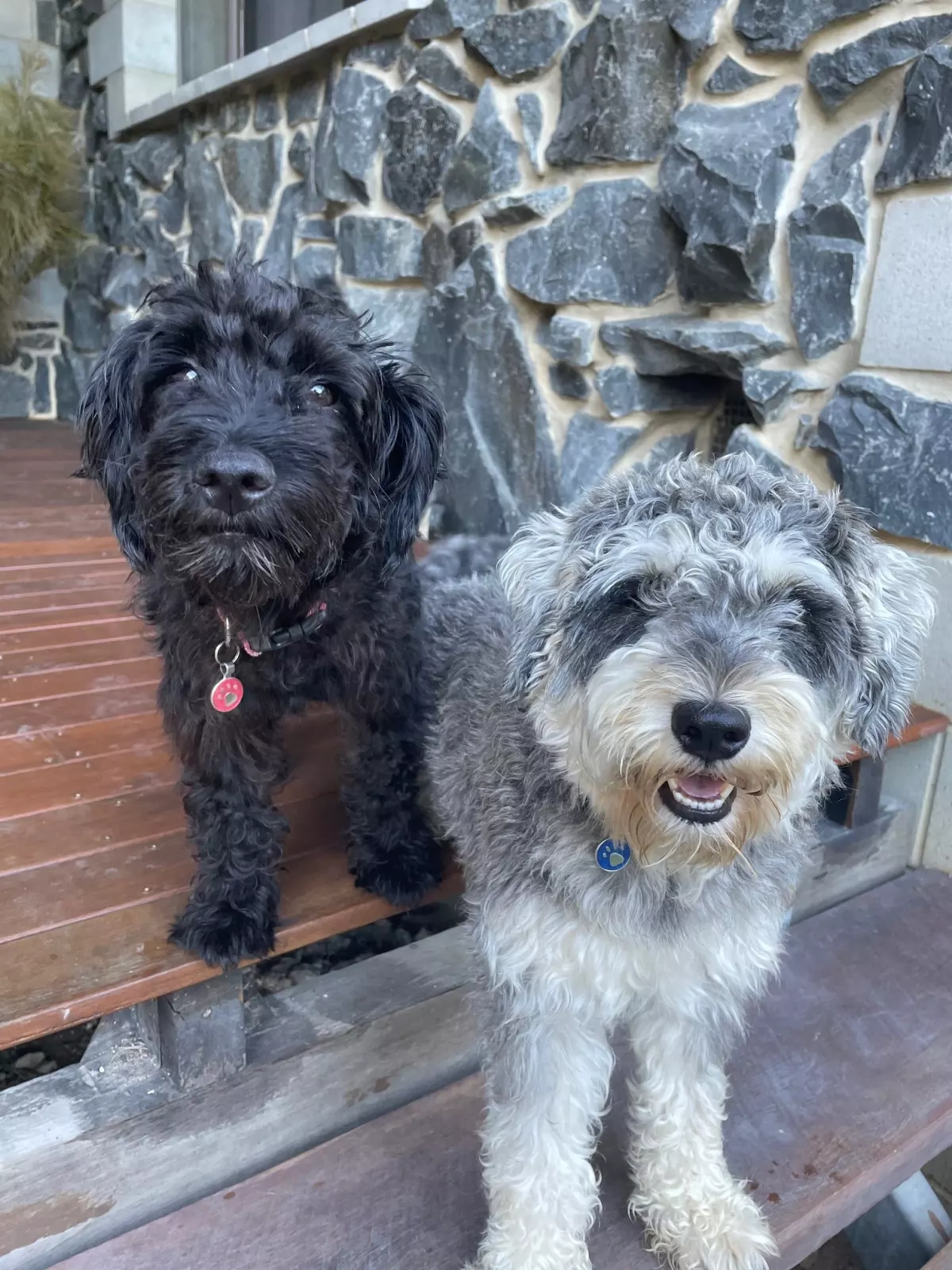 Otis is the father, and is 1/8 miniature poodle, 7/8 miniature schnauzer. He too is a lovely, friendly and smart dog who loves cuddles and sleeping on my son's bed. Otis weighs 10 kg and is salt and pepper with the classic mini schnauzer markings.