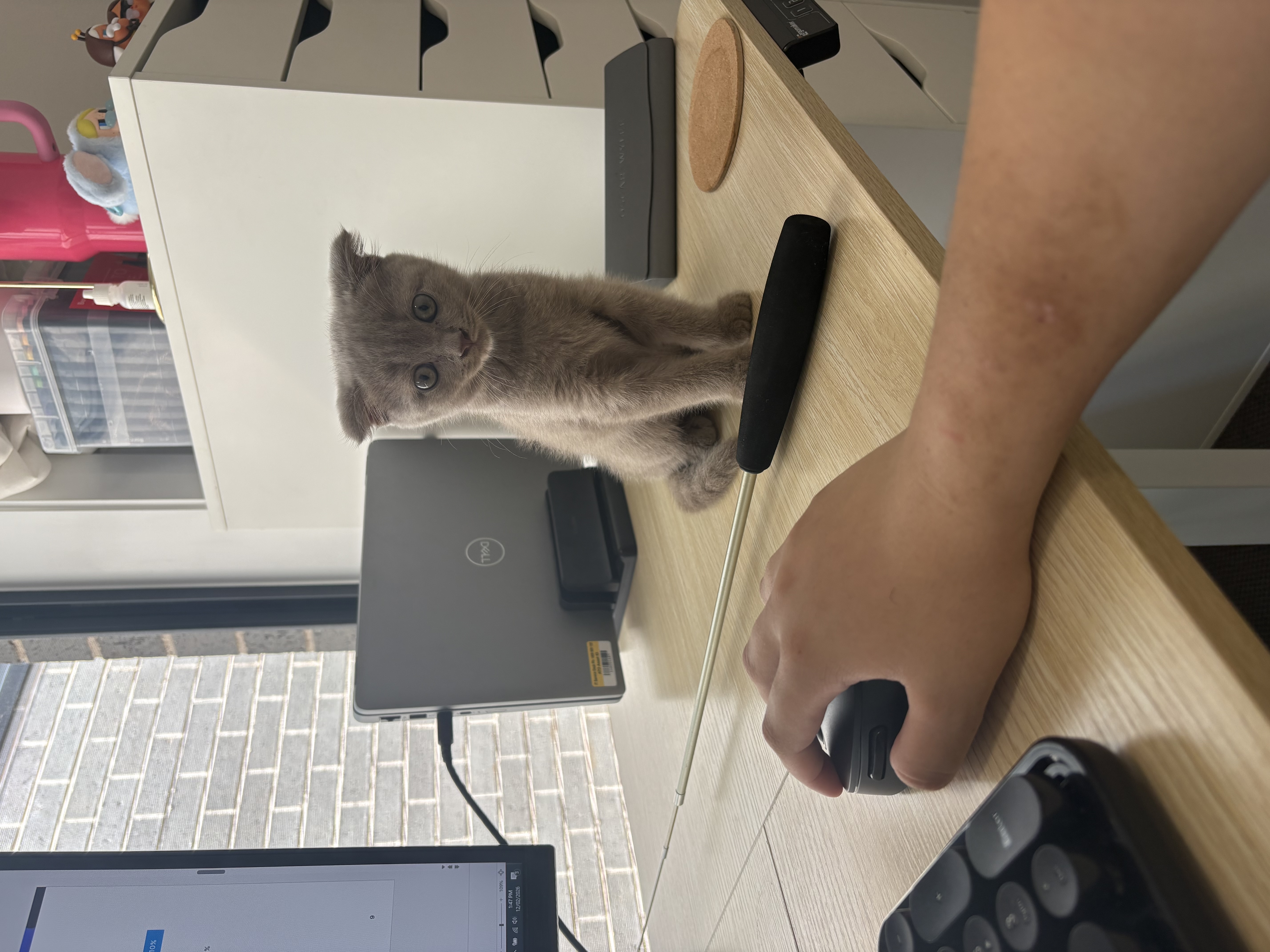 2 month old male kitten, british short hair and scottish fold mix, with grey fur and eyes.