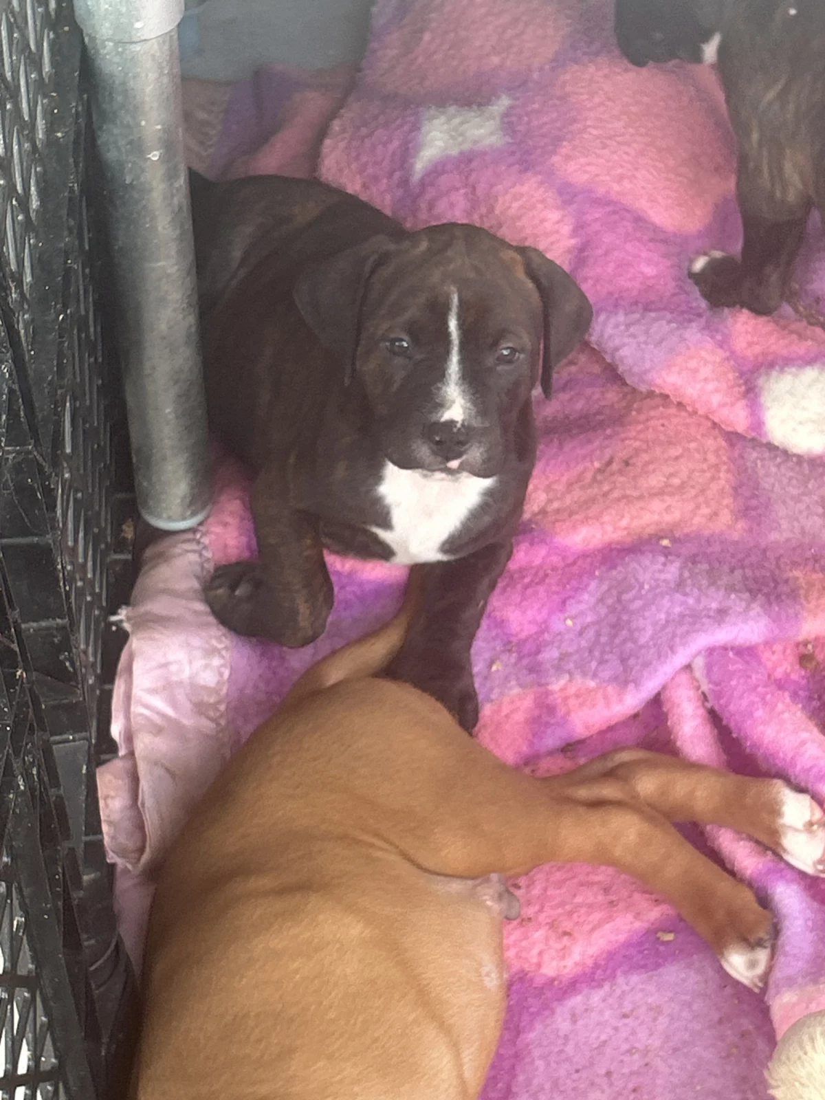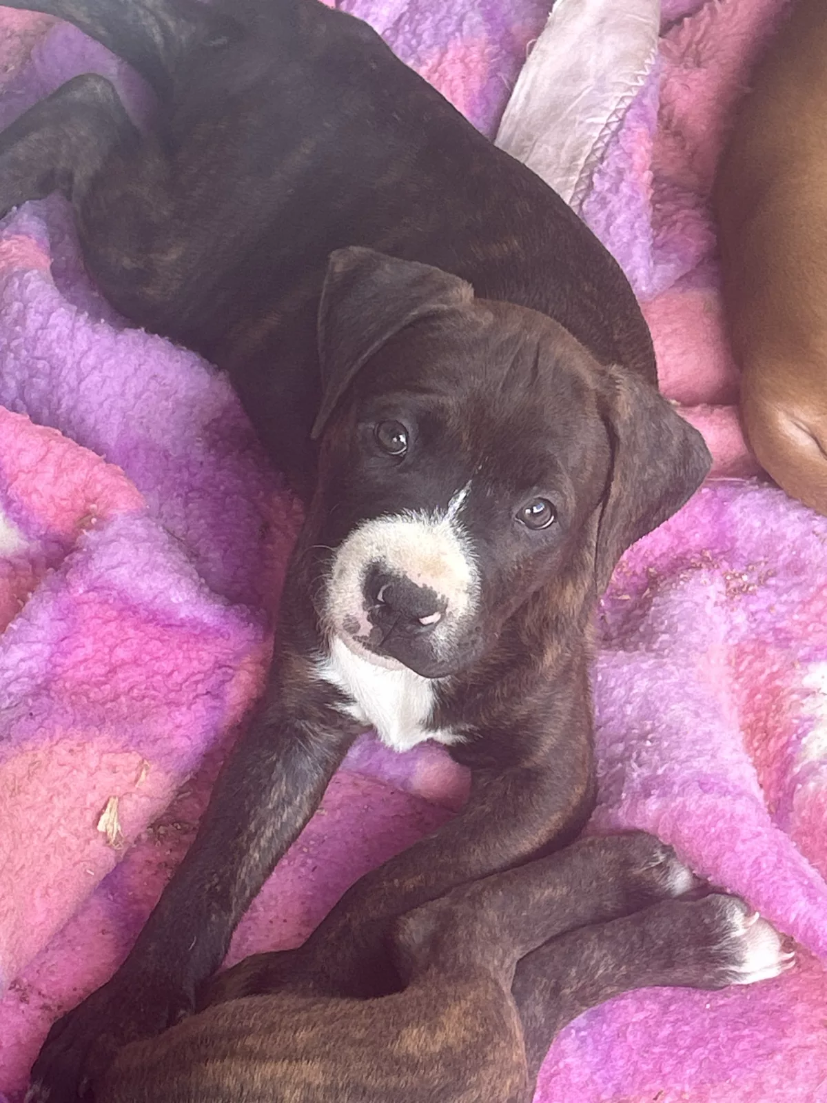 We have one handsome brindle male Shar Pei x American Staffy looking for his forever home. He has a striking brindle coat and a strong, compact build, already showing a confident and affectionate personality.