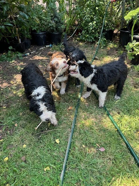 Tasmanian Smithfield puppies. Ten weeks old. Three male puppies available. Puppies have been bred to work and are active, alert, intelligent puppies with beautiful friendly temperaments. Have been brought up in a family environment and have been exposed to lots of people, dogs and other animals. All are used to being inside, outside and being contained. Basic training has commenced with all puppies given individual attention on a daily basis. Suitable to work stock or great companion dogs for active families. The two black and white pups have natural bobtail the more black puppy has a full length tail. Smithfields are incredibly intelligent and affectionate dogs that are easy to train but do require daily exercise and stimulation.