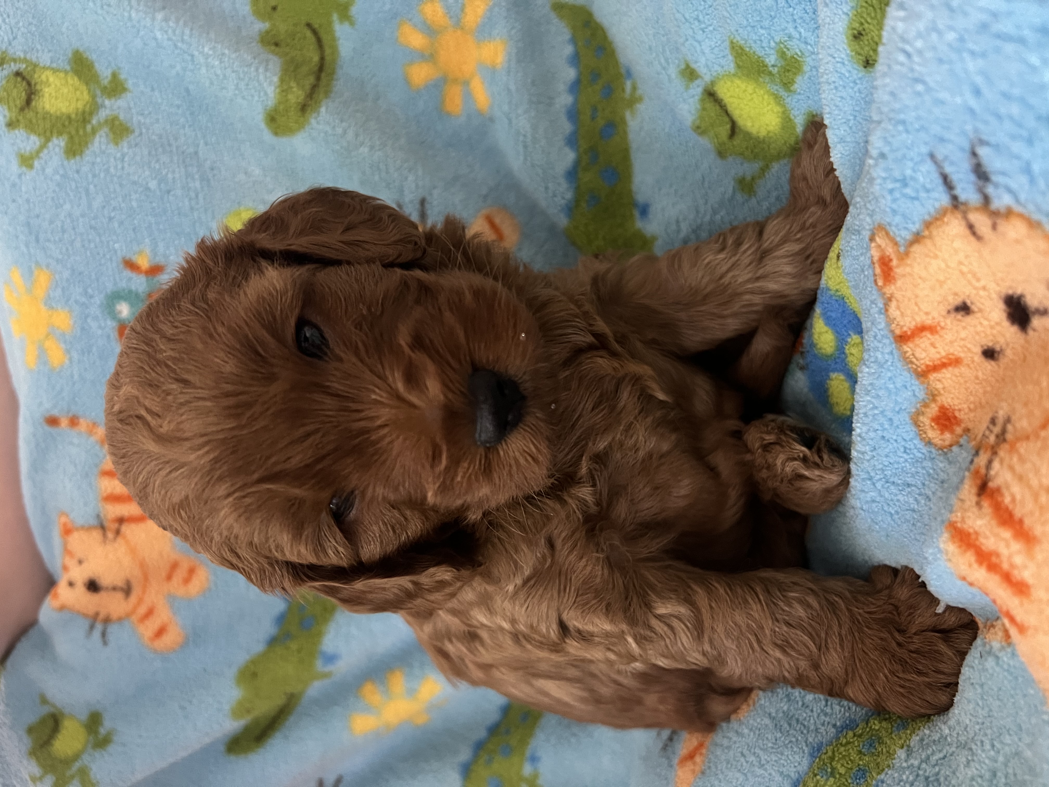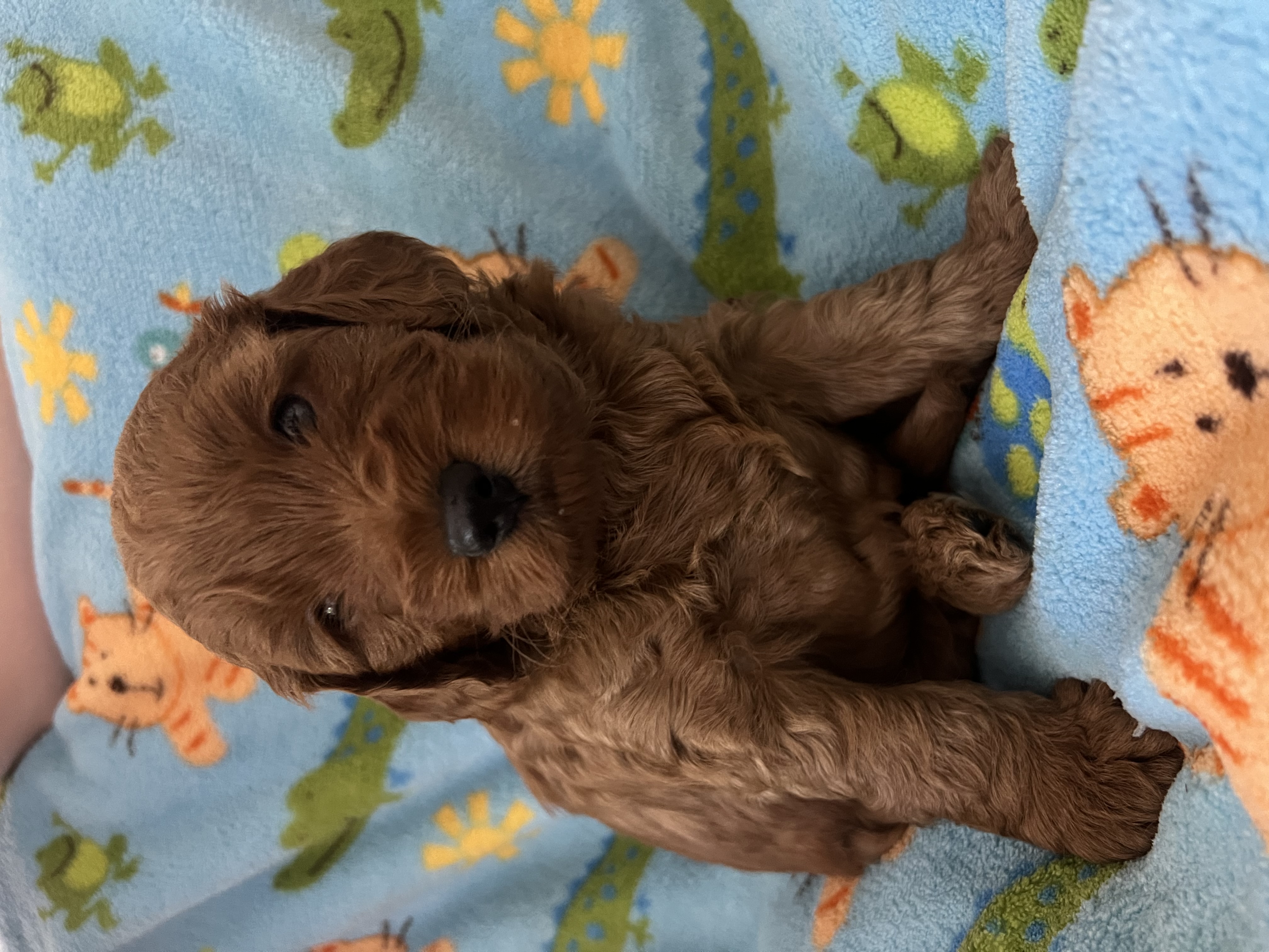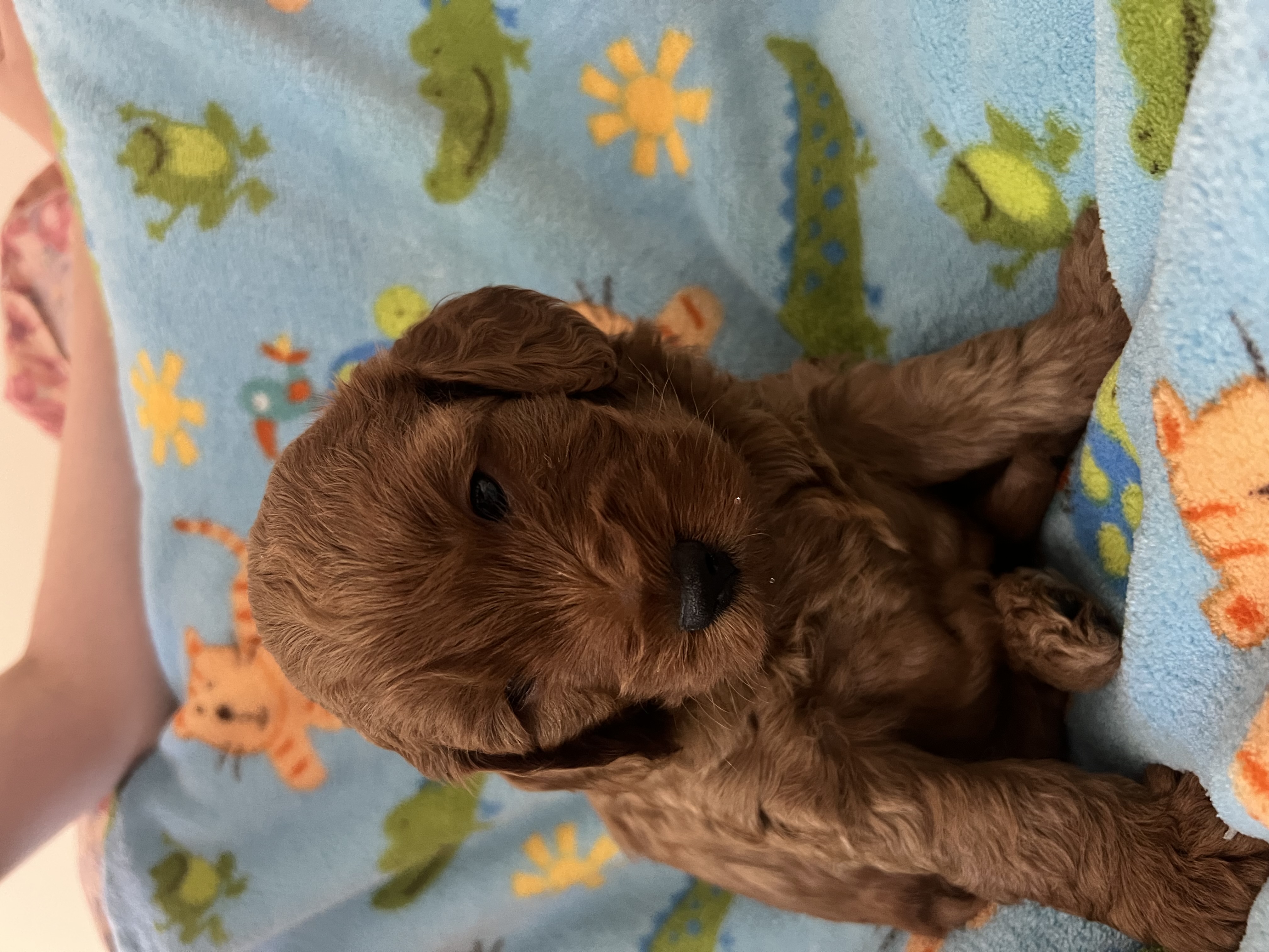 Mum is champagne-caramilk spoodle and dad is miniature red toy poodle with bow tie on. ( as in photos )