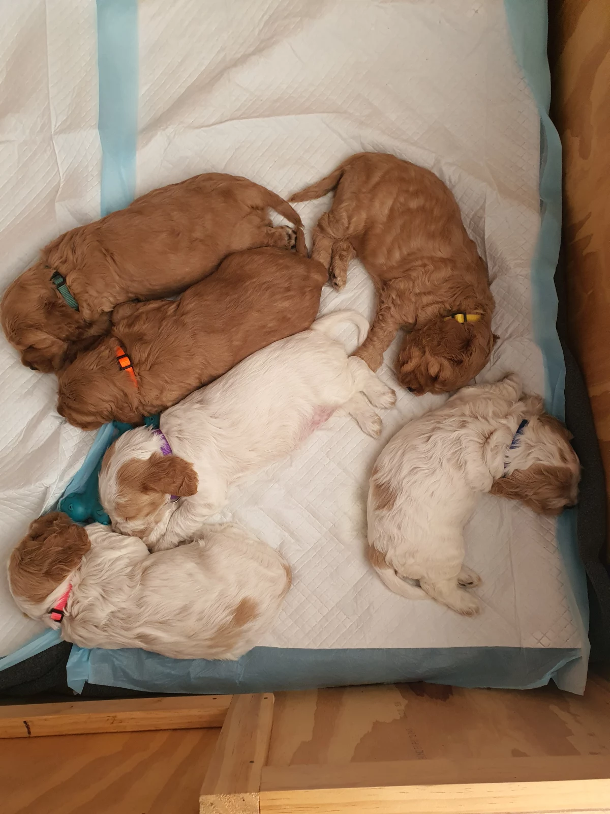 We have 3 gorgeous Spoodle puppies still available and ready to find their loving new homes. The remaining puppies include 1 gold boy, 1 white and gold girl, and 1 gold girl. They will be 8 weeks old on 20th August and ready to leave once they reach this age.