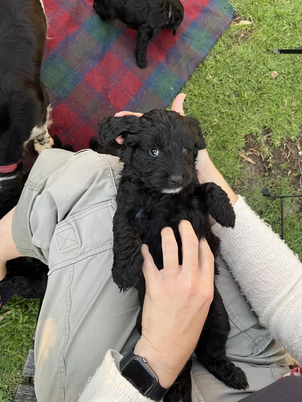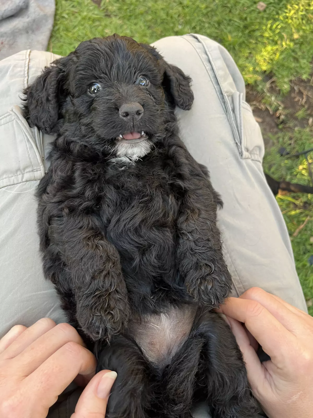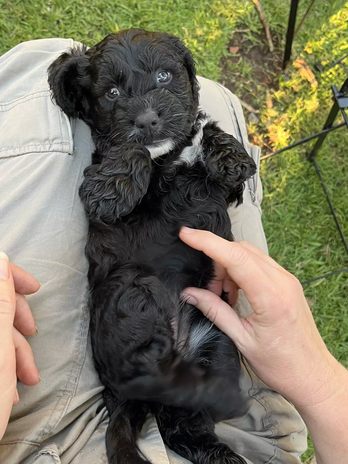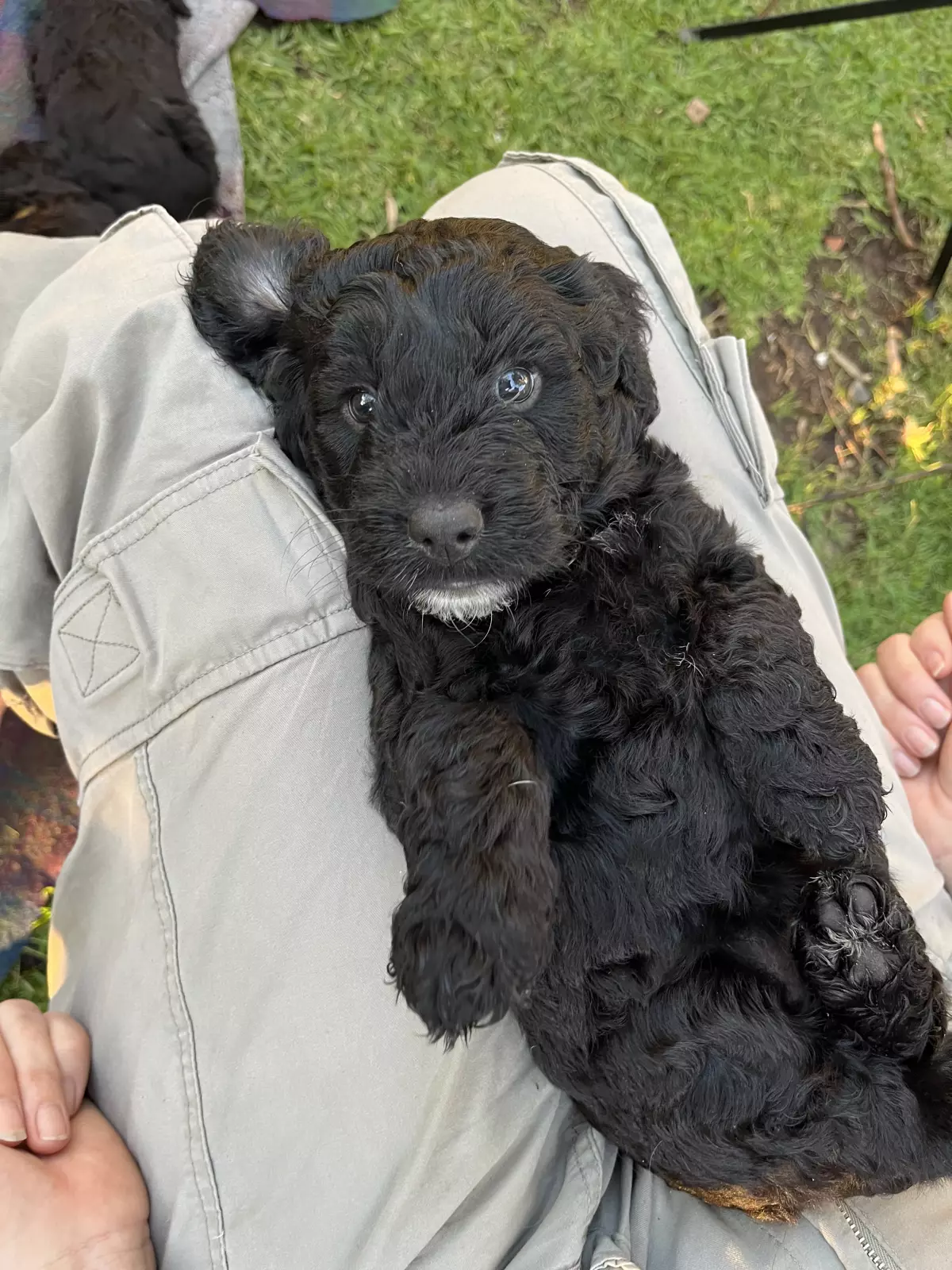 We have stunning boys and girls spoodles or sproodles for sale. They are shiny velvety black and have cute white patches mostly around the chest, neck and mask (head and nose).