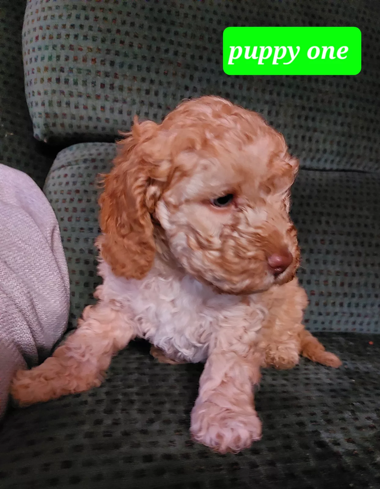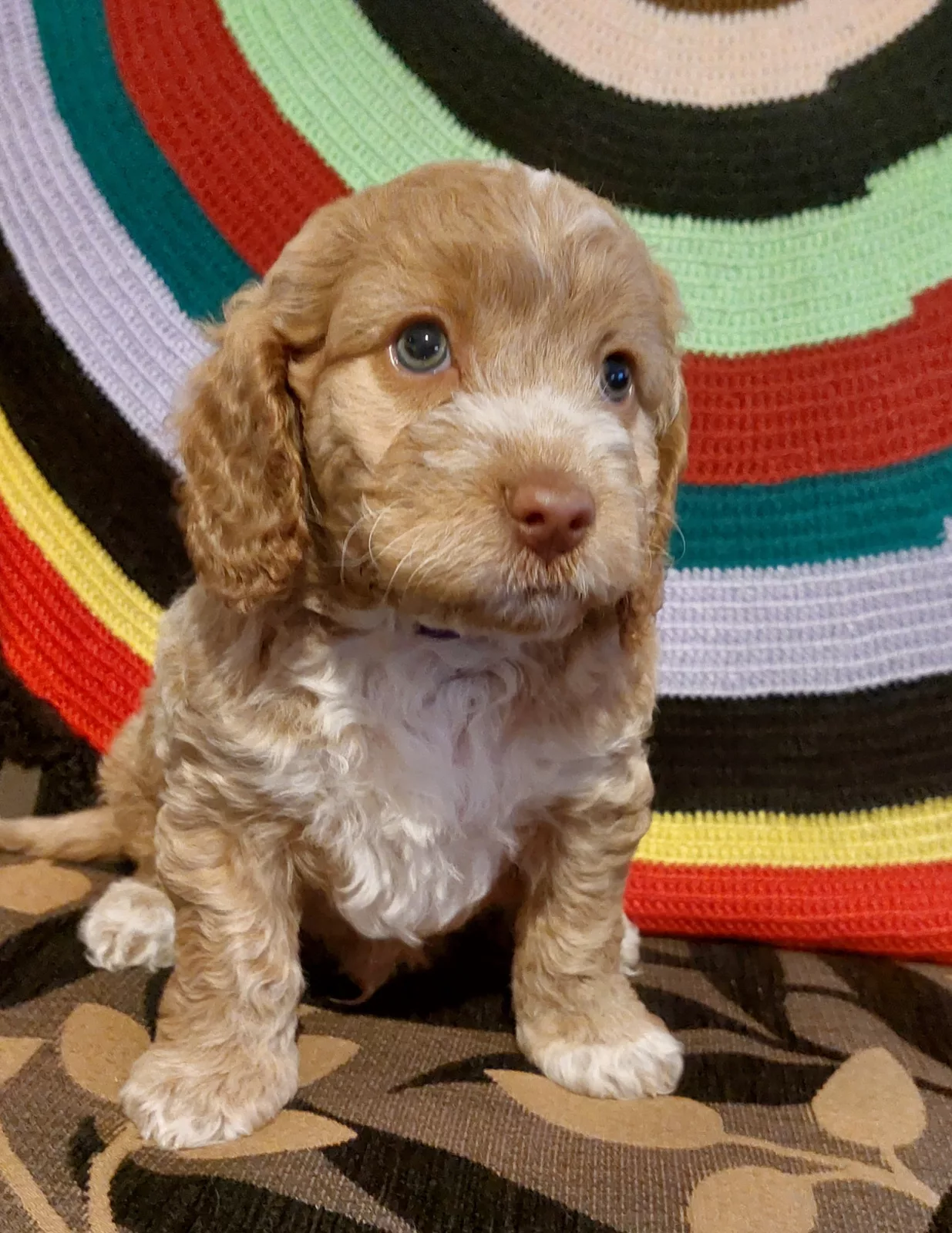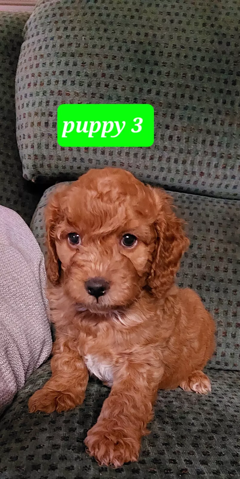 The mother is a 3-year-old Caramel & White Medium Miniature Spoodle and Father is a 3-year-old Red & White Medium Miniature Poodle.
