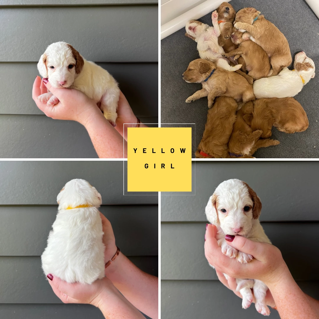 We currently have 6 beautiful spoodle puppies for sale(Green collar boy & purple & orange collar girl sold). 3 females & 3 males.
