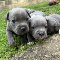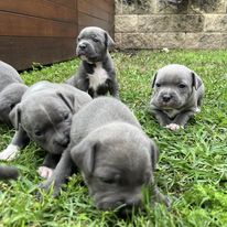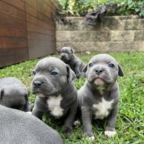 Meet our beautiful litter of the most perfect blue English Staffy puppies! The delightful Delilah and handsome Hefty welcomed their puppies on 12th April. Both mum and dad are well loved family members who love cuddles, walks, runs, swimming and plays in the dog park and we just know their pups will be the same!