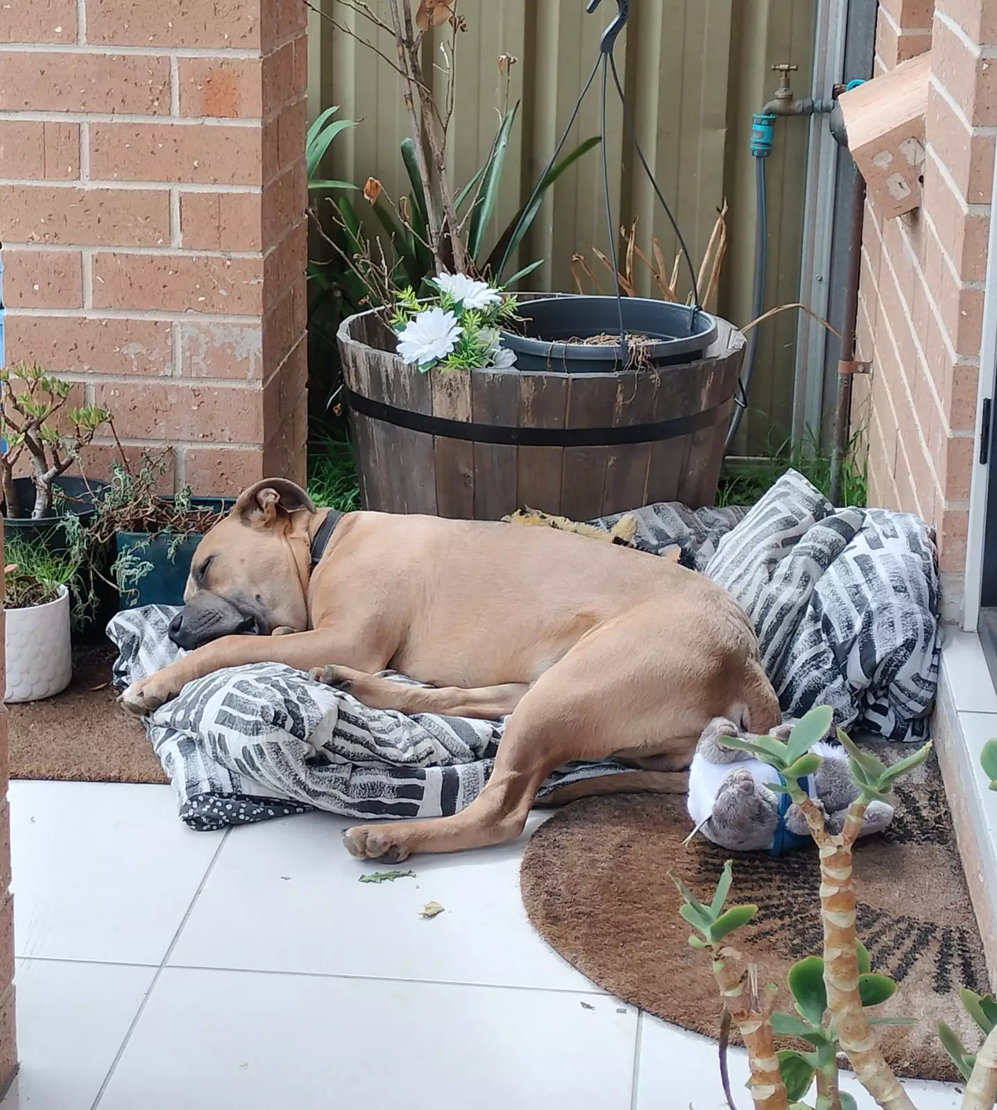 Hi My dog's name is Scooby he's a tan coloured American staffy looks alot Scooby doo hence the name 😊.