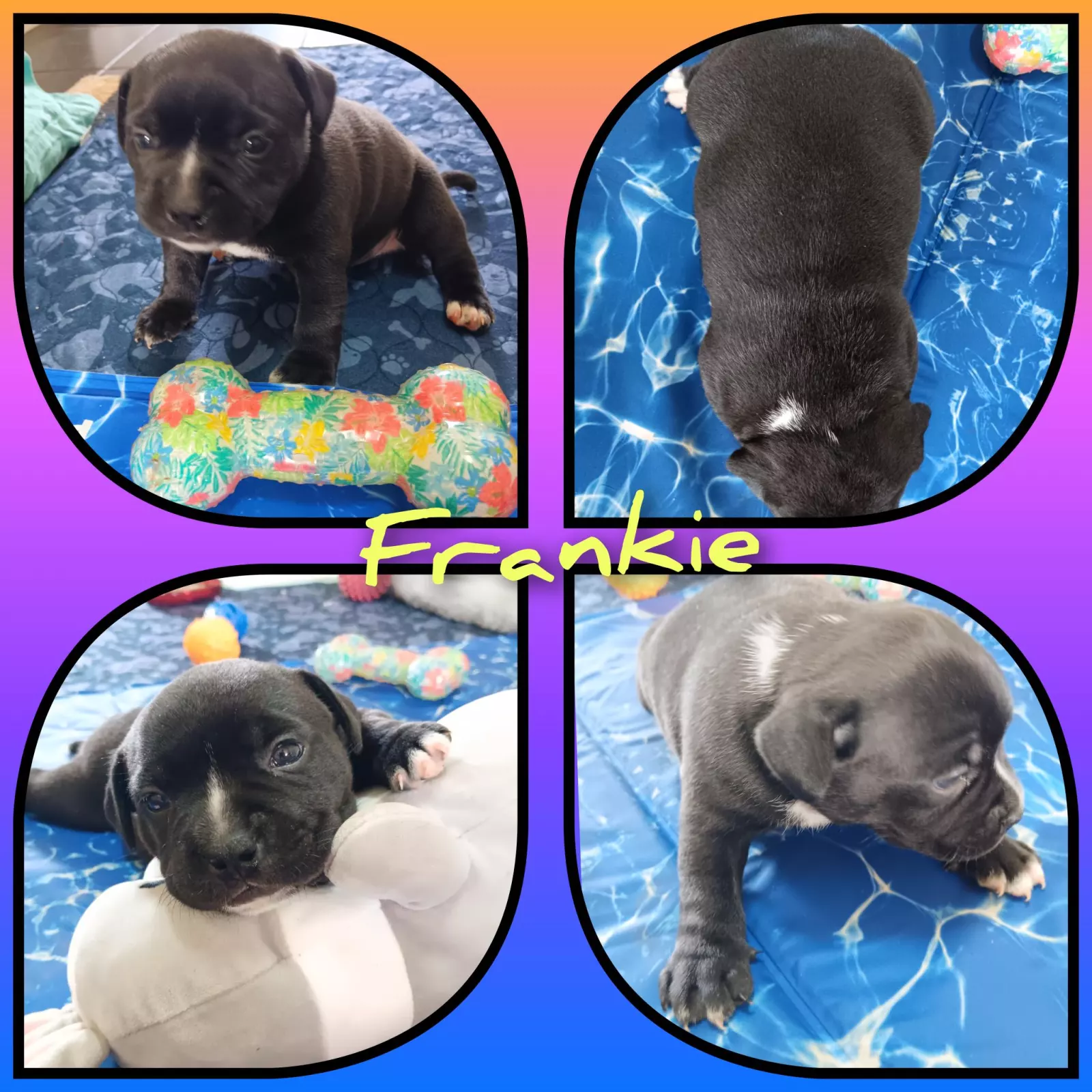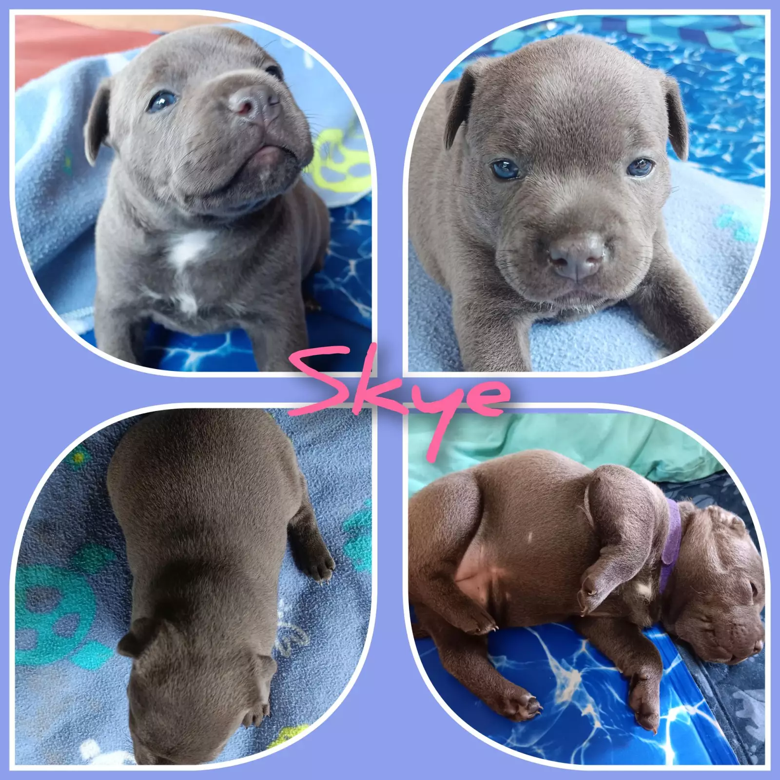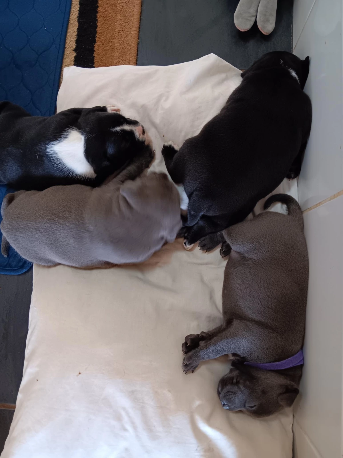 Four stunning English Staffordshire Bull Terrier puppies (4 weeks old as of 06/02/25). One blue boy, one blue girl, two black girls. These beautiful pups were born on 9th January 2025 and are ready to go to their forever home on 6th March 2025 at 8 weeks old. Father is a Pedigree papered Blue English Staffy (Aceblue Stewie Griffin). Mother is a Purebred English Staffy (Black with white collar). Puppies are being raised in a loving home (they are our babies), are fed high quality food and are socialised well with children. Puppies have lovely natures, love cuddles, exploring and are starting to toilet train. Pups are wormed fortnightly and will be vet checked, microchipped and vaccinated at 7 weeks old. To go to a loving family who has time to play with them.