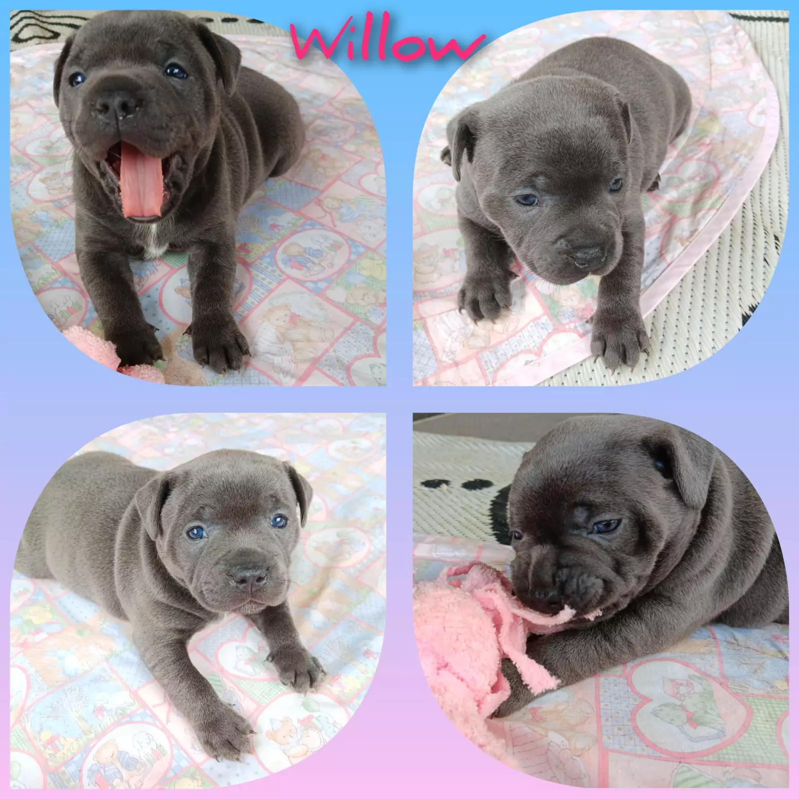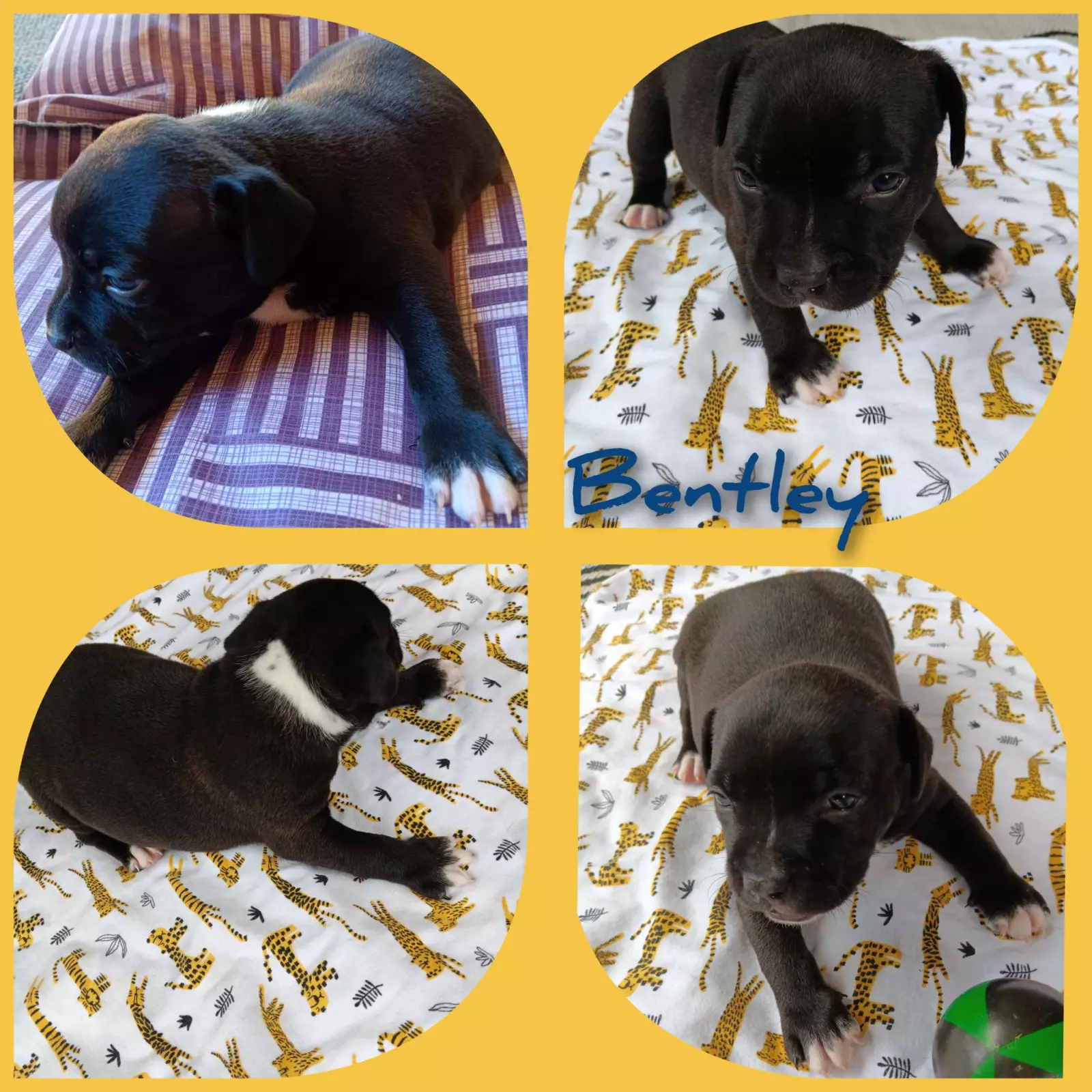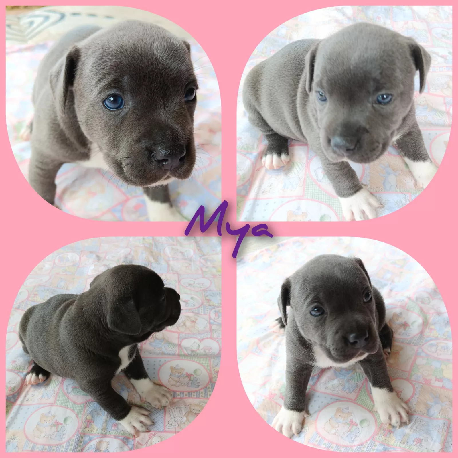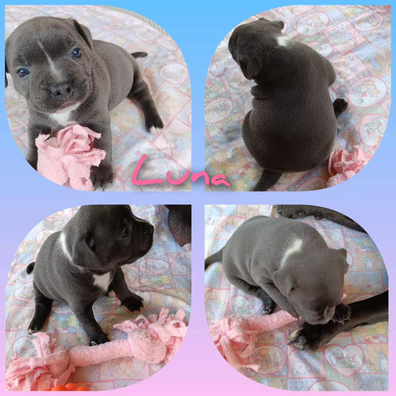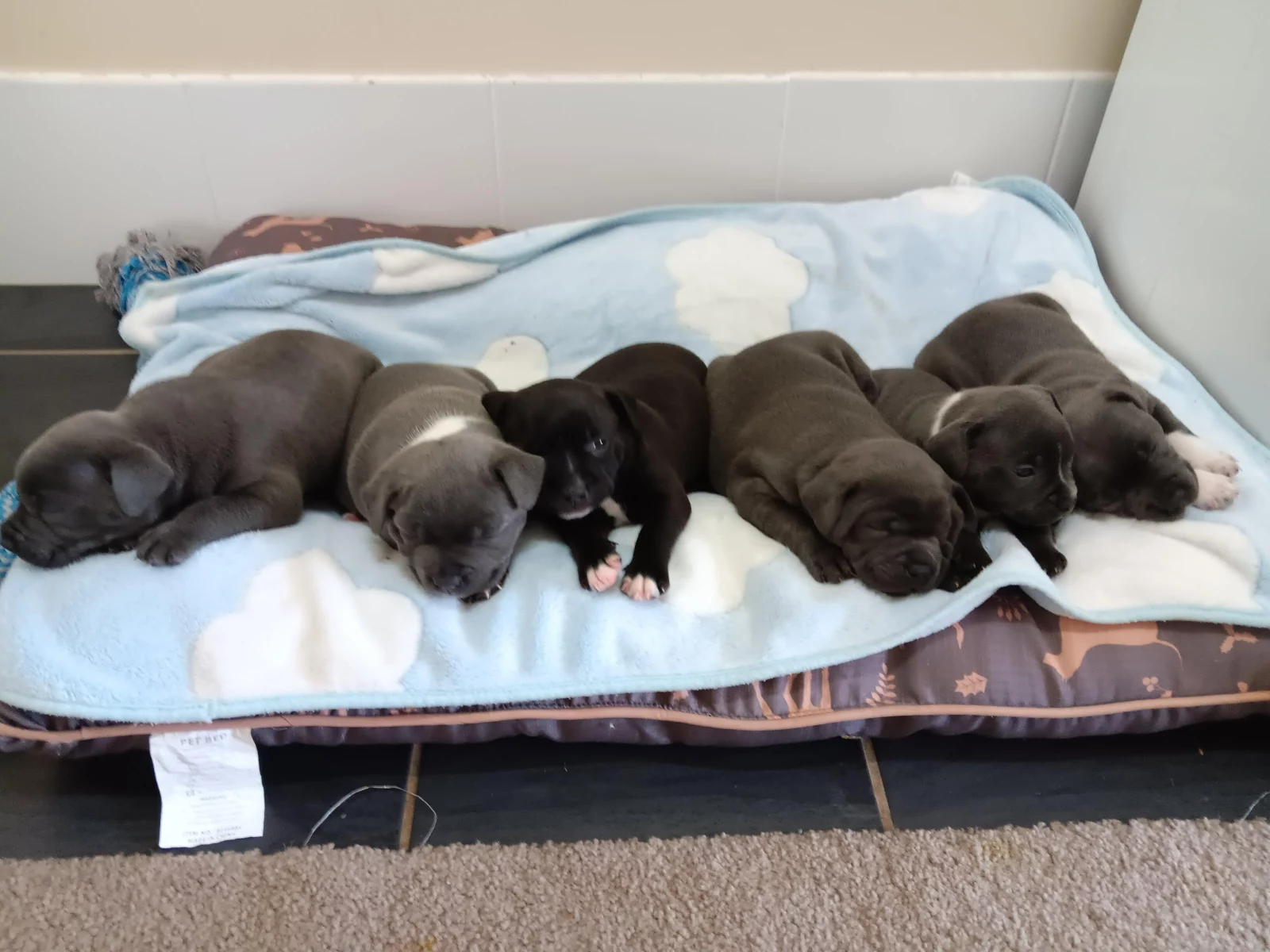 Six stunning English Staffordshire Bull Terrier puppies (currently 4 weeks old as at 11/02/24). Two blue boys, three blue girls, one black boy with white collar. These beautiful pups were born on 14th January 2024 and are ready to go to their forever home on 10th March 2024 at 8 weeks old. Father is a Pedigree papered Purebred Blue English Staffy. Mother is a Purebred English Staffy (Black with white collar). Puppies are being raised in a loving home (they are our babies), are fed high quality food and are socialised well with children. Puppies have lovely natures, love cuddles, exploring and are starting to toilet train. Pups are wormed fortnightly and will be vet checked, microchipped and vaccinated at 7 weeks old. To go to a loving family who has time to play with them.