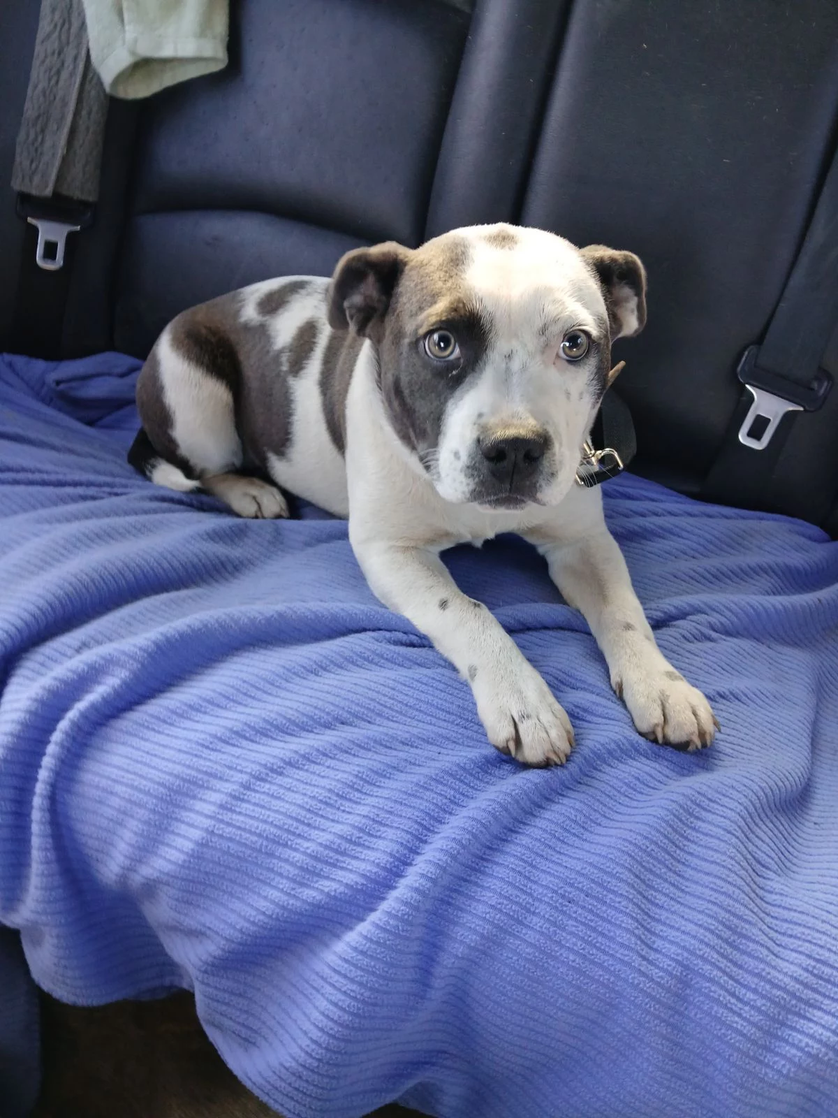 Female, blue brindle and white. Has basic training. Beautiful temperament.