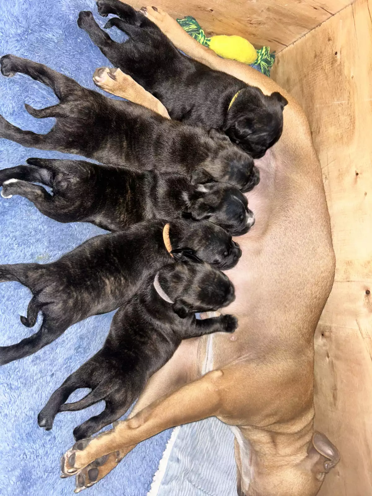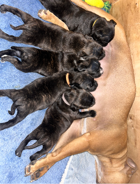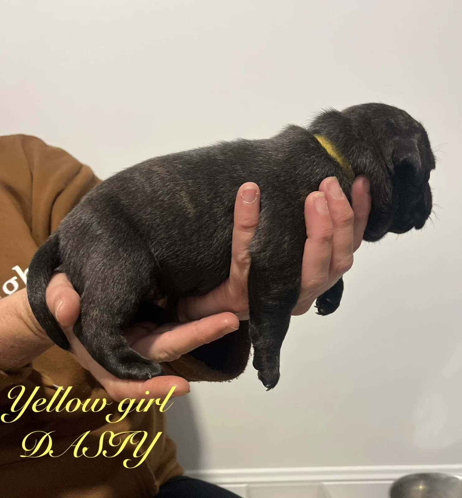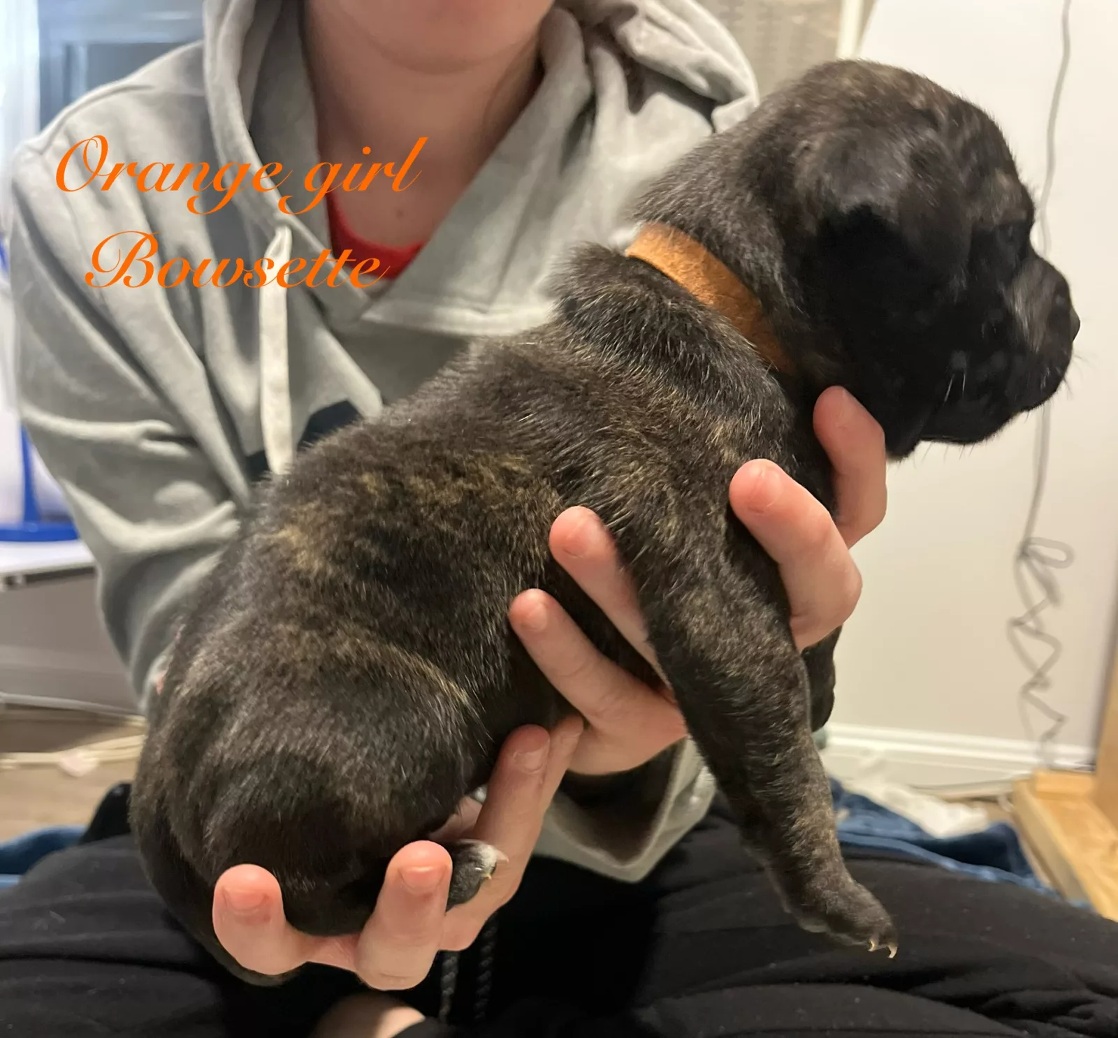 These little pumpkins are waiting for there forever homes and families. They are growing so fast and there personalities are starting to show. The names in photos are only a reference as we stuck with the theme of mum and dads name Peach and Bowser They will be doing training with desensitisation, potty, handling. All will come vaccinated and microchipped 4 girls 1 boy Born: 19/05/25 Ready: 13/07/25 Colour: all brindle, some with white markings and little socks Mum Peach - tan colour Dad Bowser - blue when puppy but body has turned brindle If you have any interest please let me know and more then happy to send more photos or answer any questions