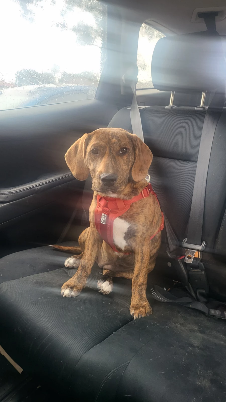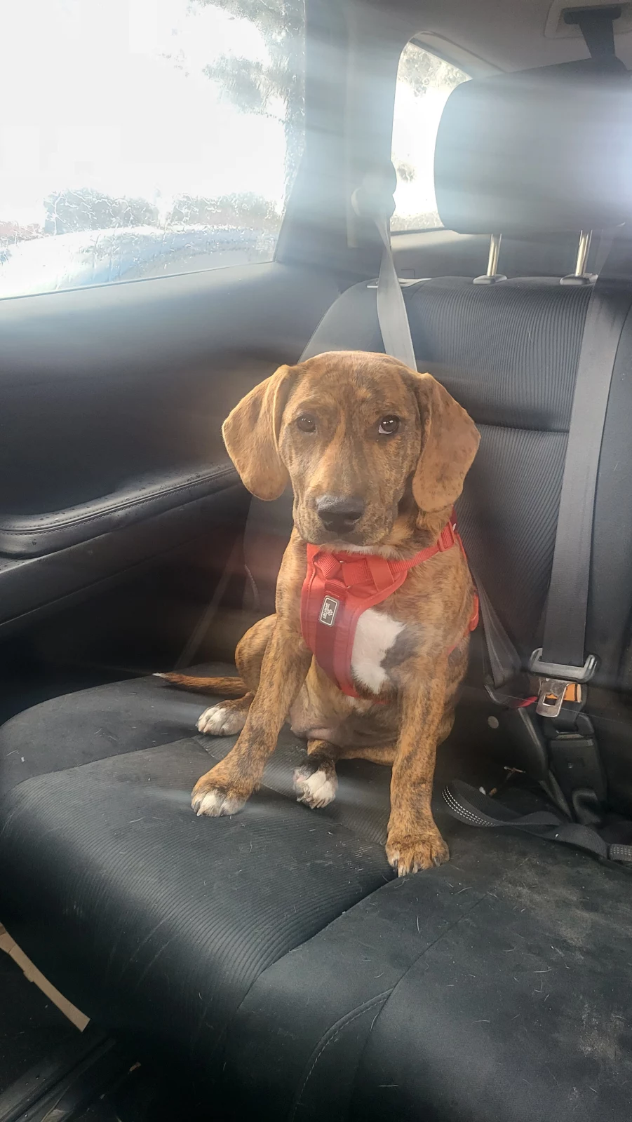 Willow is a beautiful, happy playful girl. She has an amazing orange/brindle coat with tiger like markings. She is a very pretty girl with deep brown eyes. Willow will try anything. Play with a ball, tug on a rope or just chew a toy or cow ear. She is loving her walks on her harness, and is even more than willing to make a few friends at the park. She loves to play outside and then have big cuddles indoors. She has a big personality and loves her food. She is a true Staffy/Beagle mix