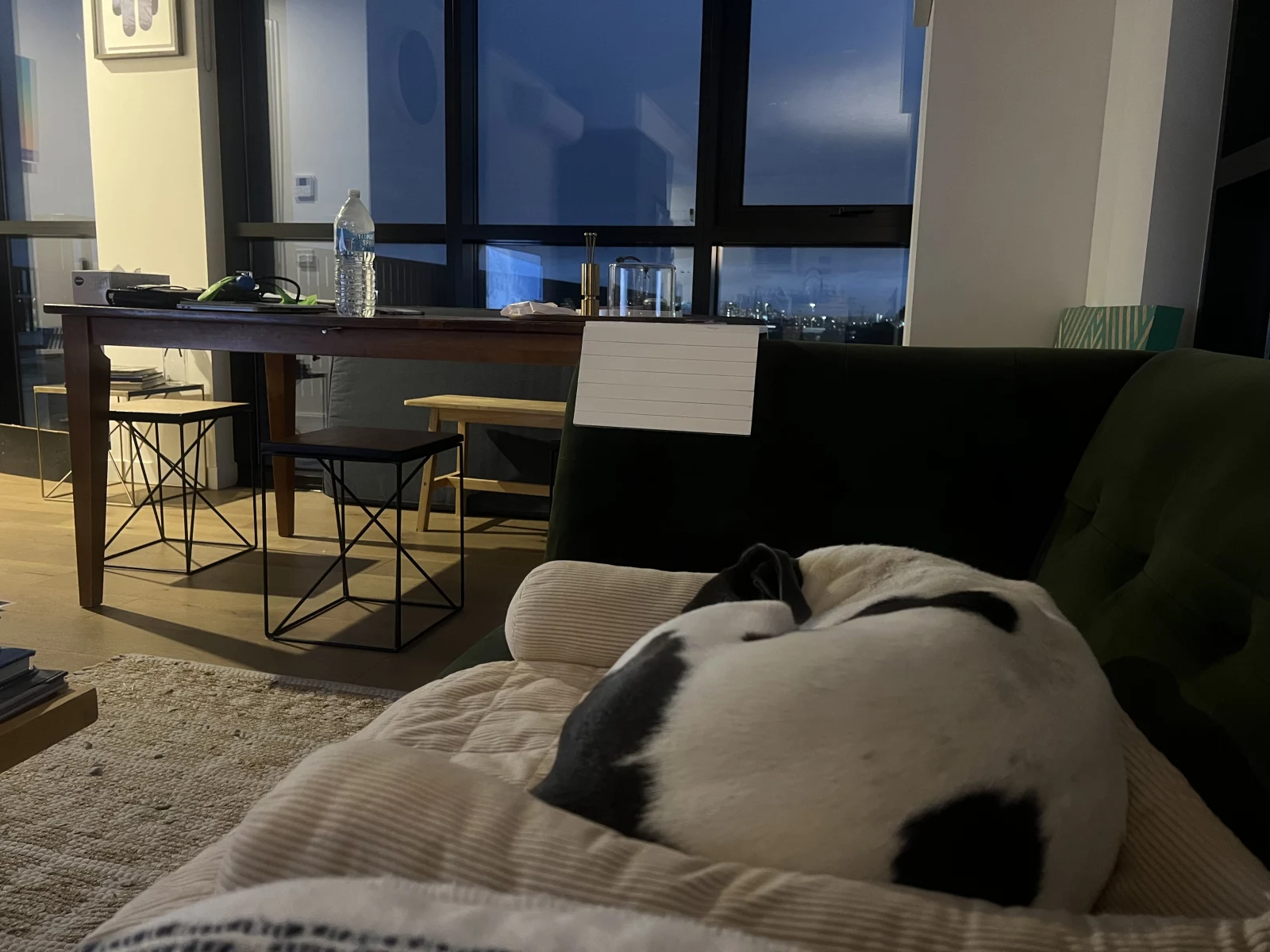 Dogs have access to: warm bedding, water at all times, ample space to exercise, natural light