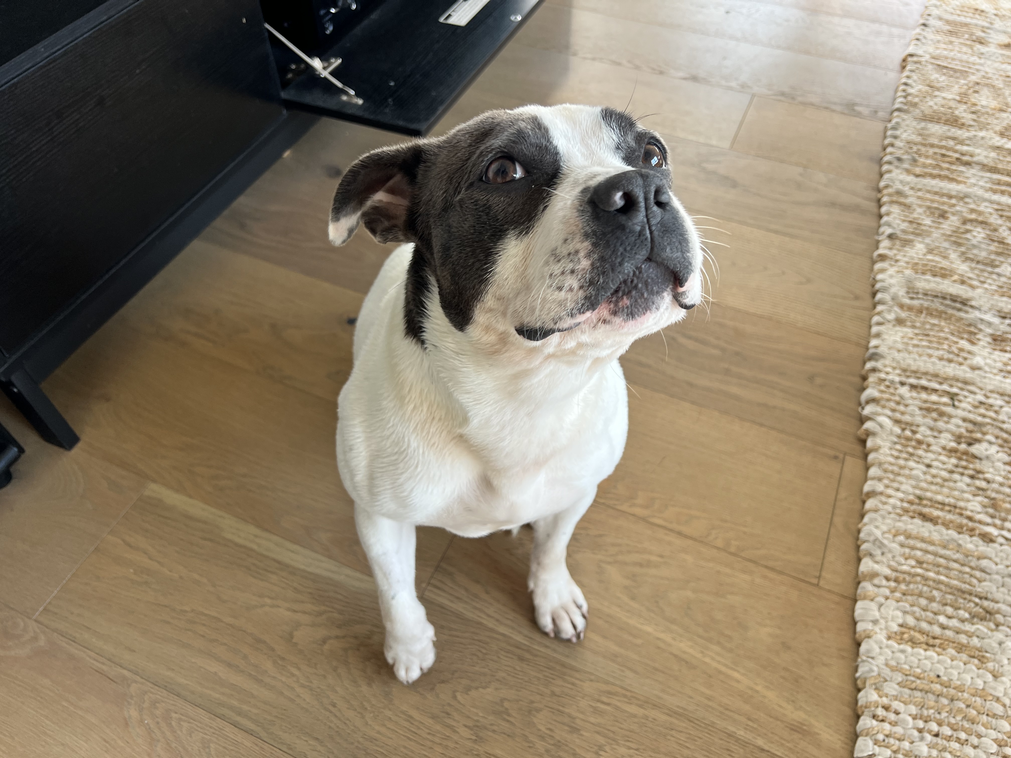 Missy is house / apartment trained and is comfortable on a lead with a treat-based incentive system in place. She enjoys water sports (beach), chasing the frisbee, hose fun, chewing bones (not furniture) and not barking too much (has an entertaining half-bark). We suspect a Frenchie has been on the scene at some point due to her personality, facial set and size (but cannot confirm)