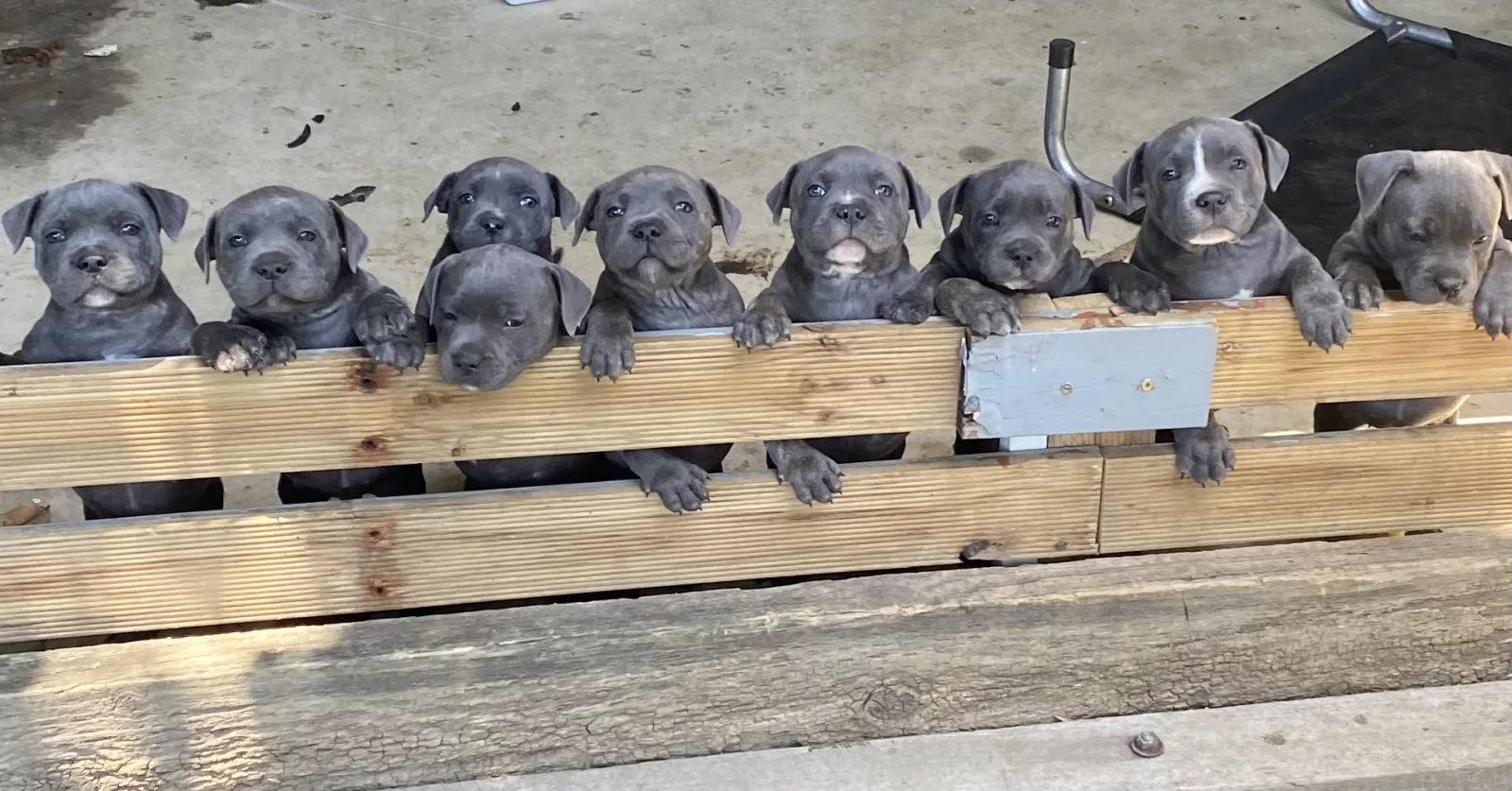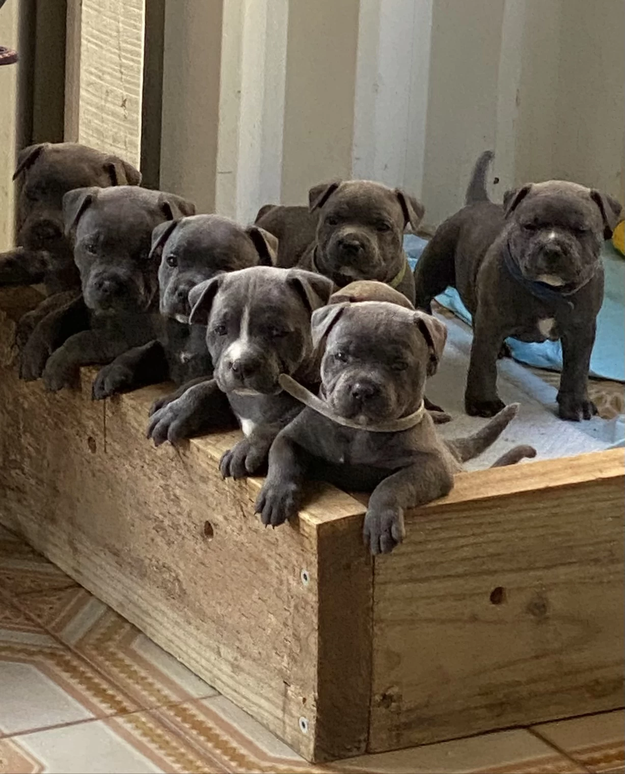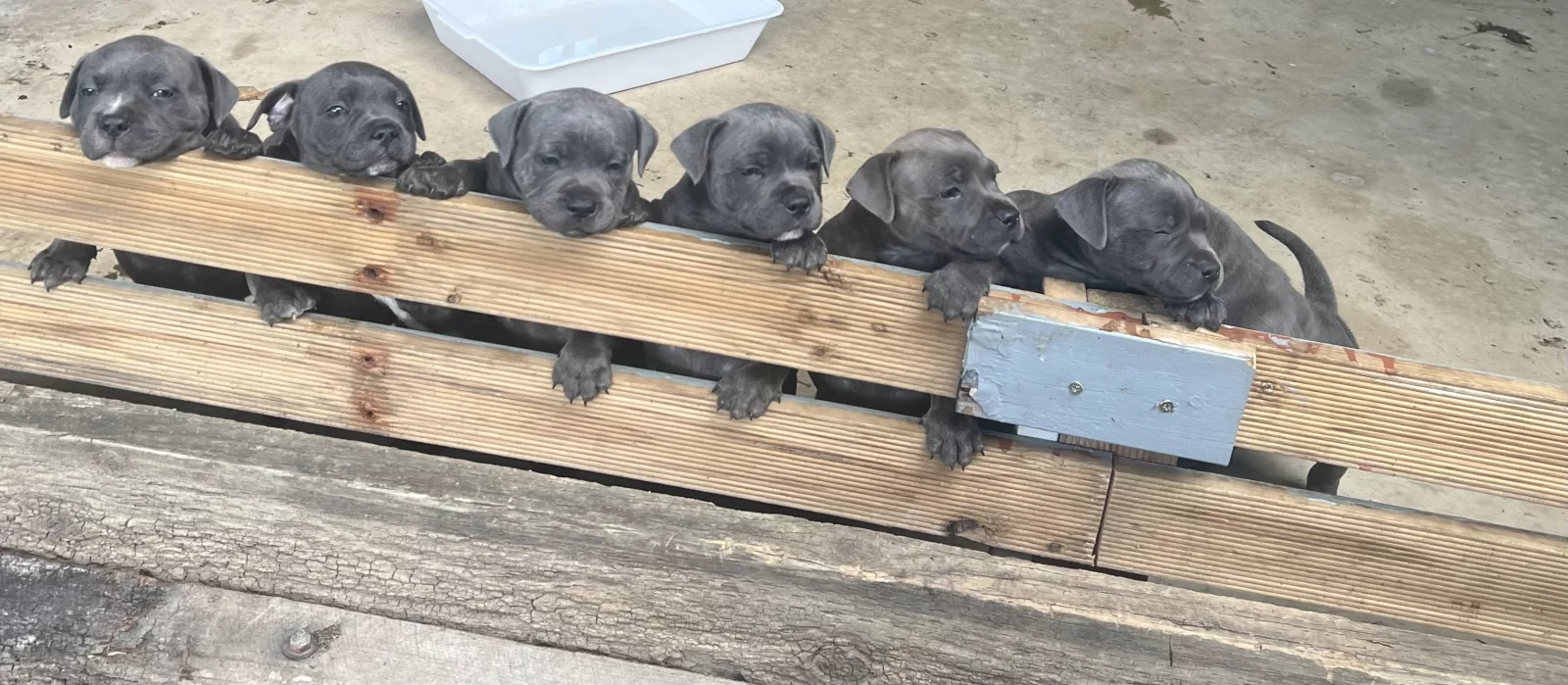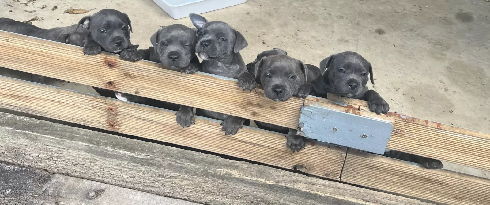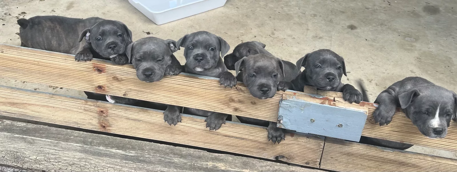 I have 5 male English Staffy puppies available for sale — beautiful blue and fawn boys with strong builds and great temperaments. These pups are 8 weeks old and ready to go to their forever homes now for $2,500 each.