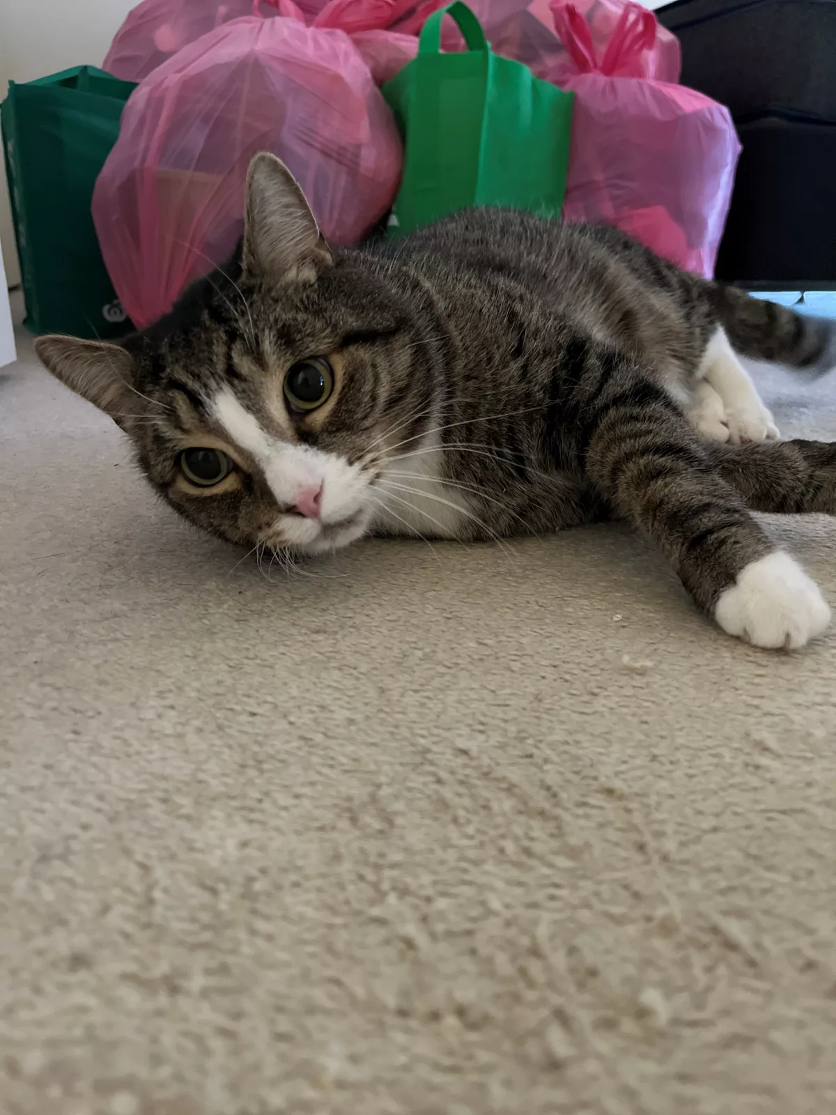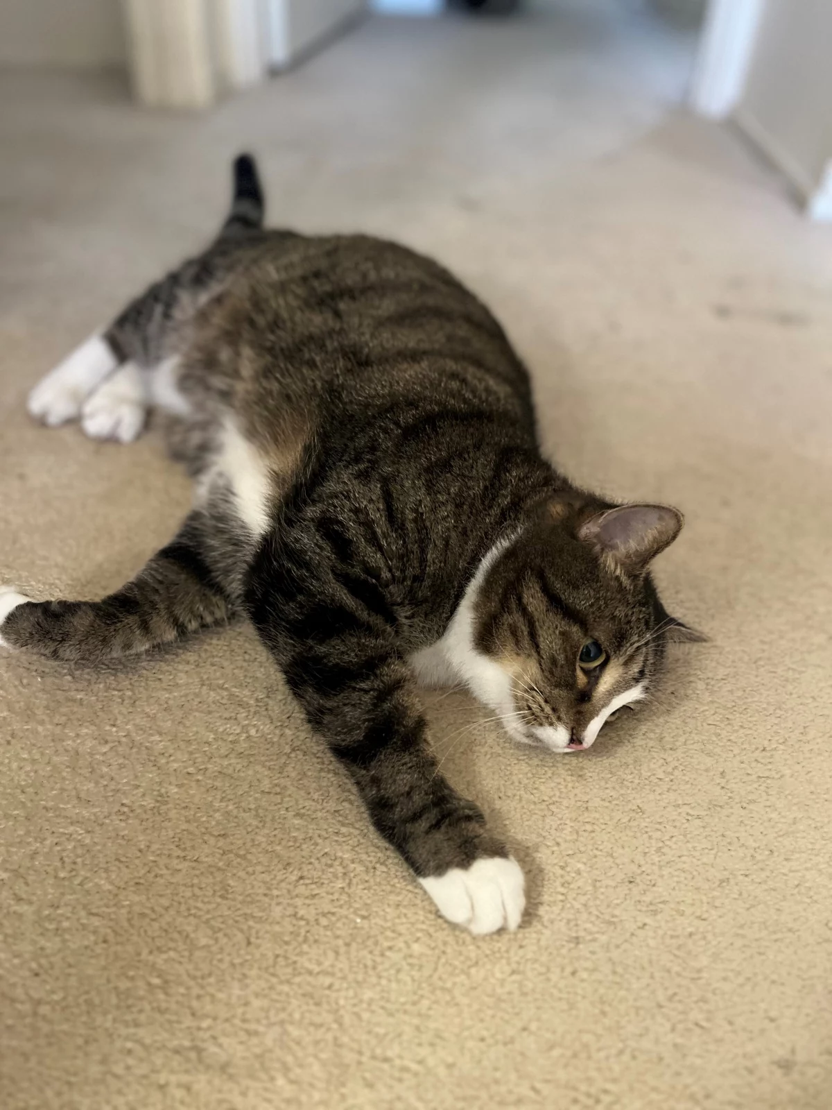Tiger is the epitome of a charming and easygoing feline. With his affectionate disposition, he enjoys lazily lounging around, soaking in the simple joys of life while waiting patiently for his human's loving acknowledgment. His sweet, kitten-like meow is his gentle way of requesting bedtime cuddles, showing just how attentive he is to the routine of mutual affection. Tiger does love his meals, sitting patiently like a little gent and savoring each bite carefully.