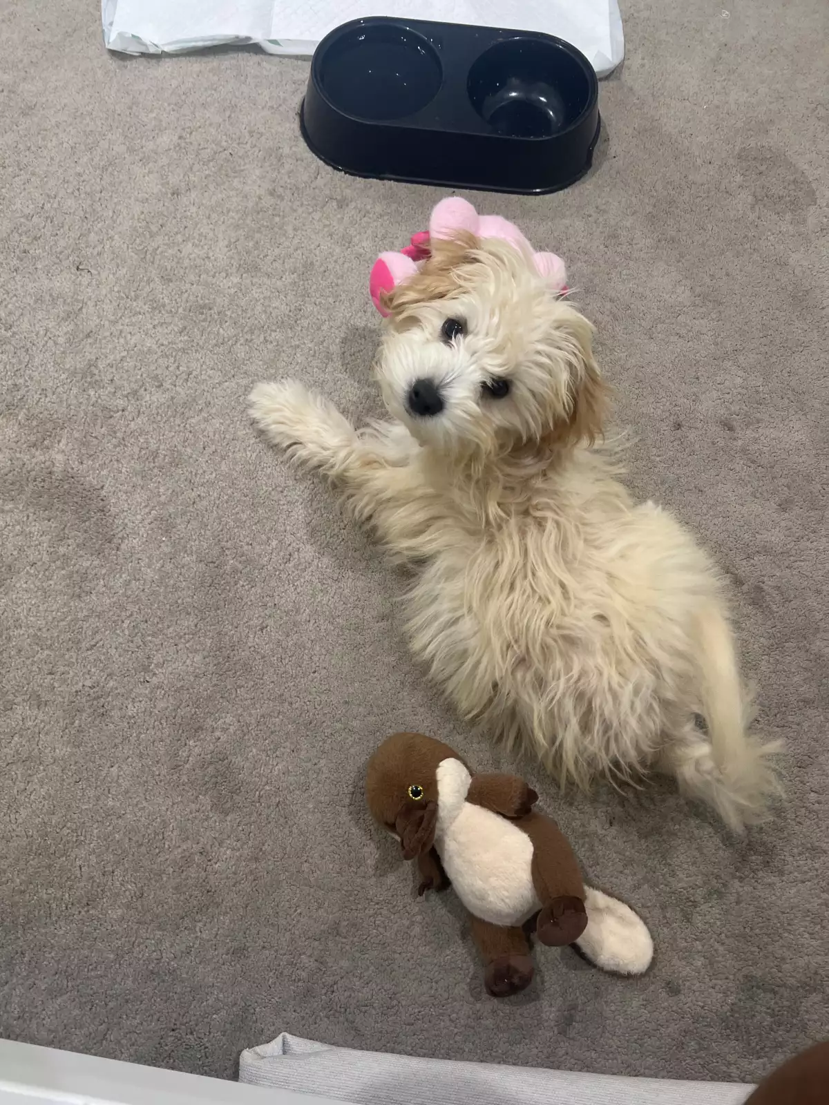 He is used to a home environment and spends most of his time indoors with regular outdoor play. He is comfortable around people and is getting used to daily routines like feeding and sleeping times. He eats puppy food and is learning basic habits. He has a gentle routine with playtime, rest, and short periods of activity suitable for his age.