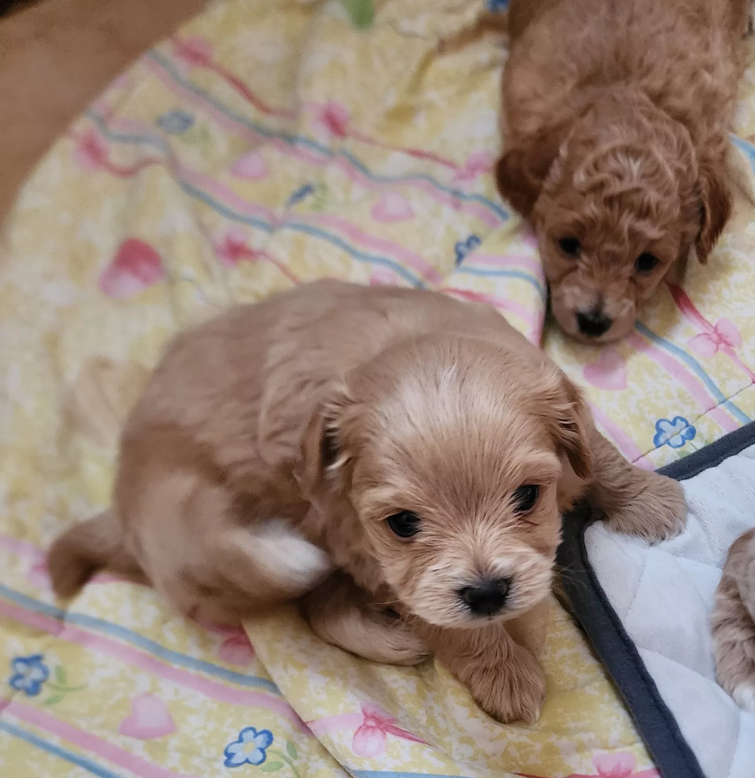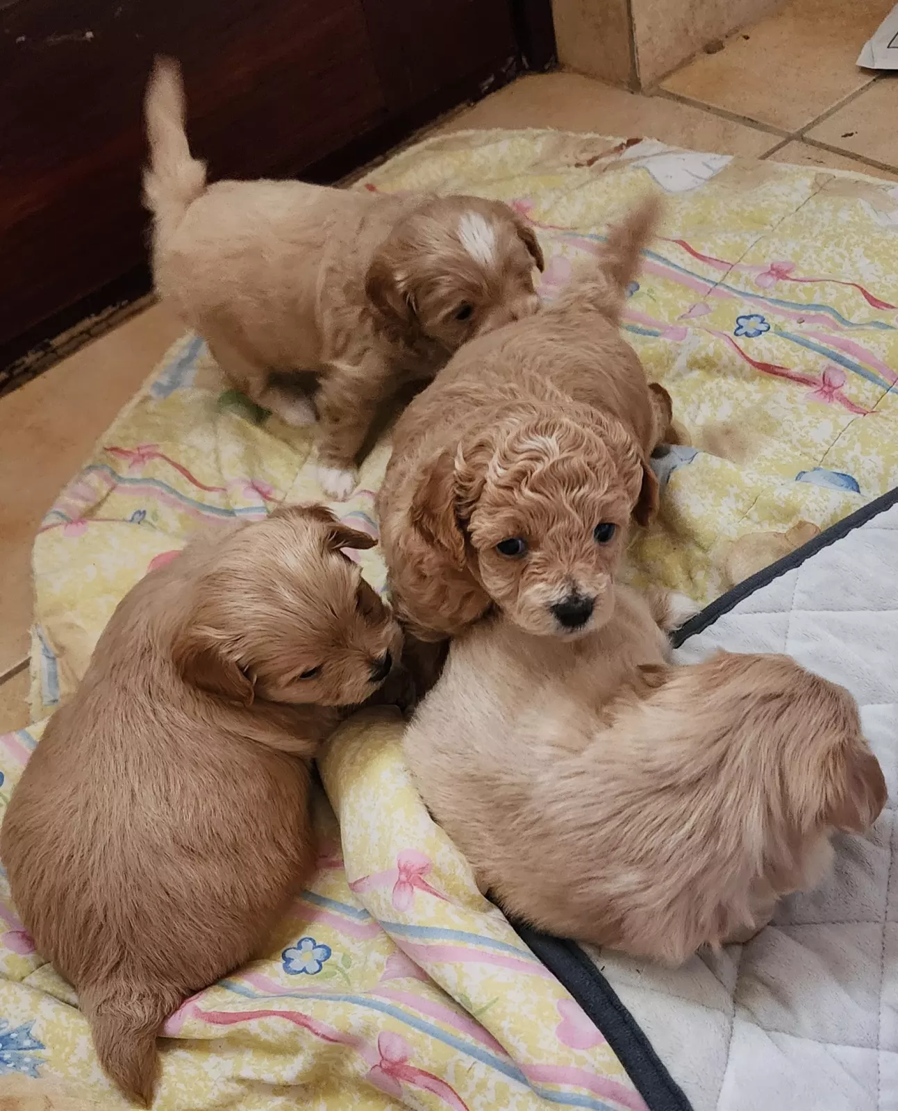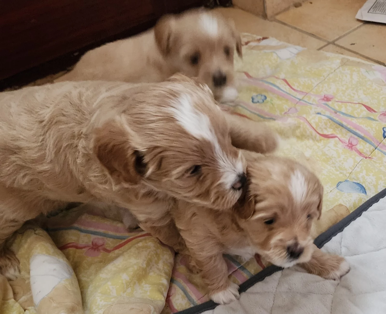 Amber our 2.5 year old Bichon (cross) mated with Blaise a chocolate coloured Toy Poodle 6/4 and she whelped 6 adorable puppies on Sunday June 9th. She had 4 girls and 2 boys. Four of the puppies are spoken for, however 2 beautiful girls remain. All of the puppies are thriving and already demonstrate calm and placid natures. They are 5 weeks old now and love a cuddle and scratch and are playful. They all enjoy just being held. Amber is a great mother and feeding them very well. They will be Vet checked and vaccinated and microchipped in 1-2 weeks time