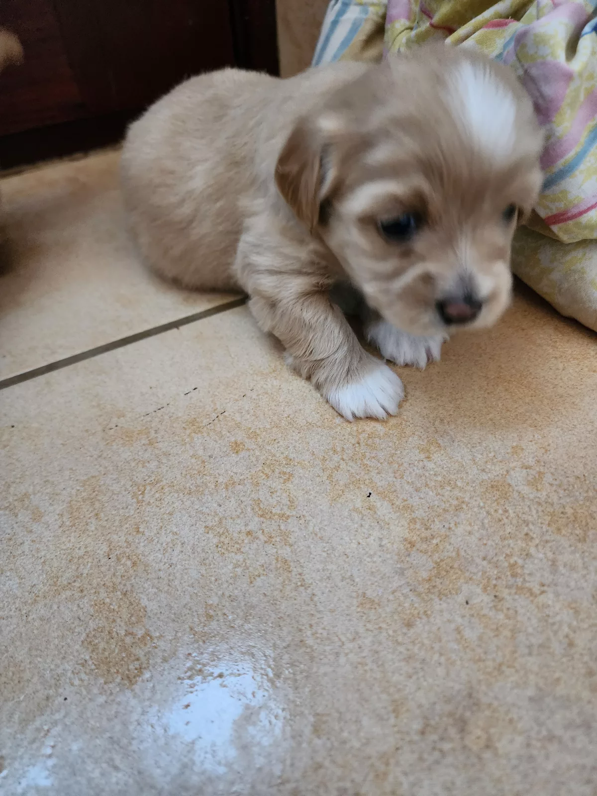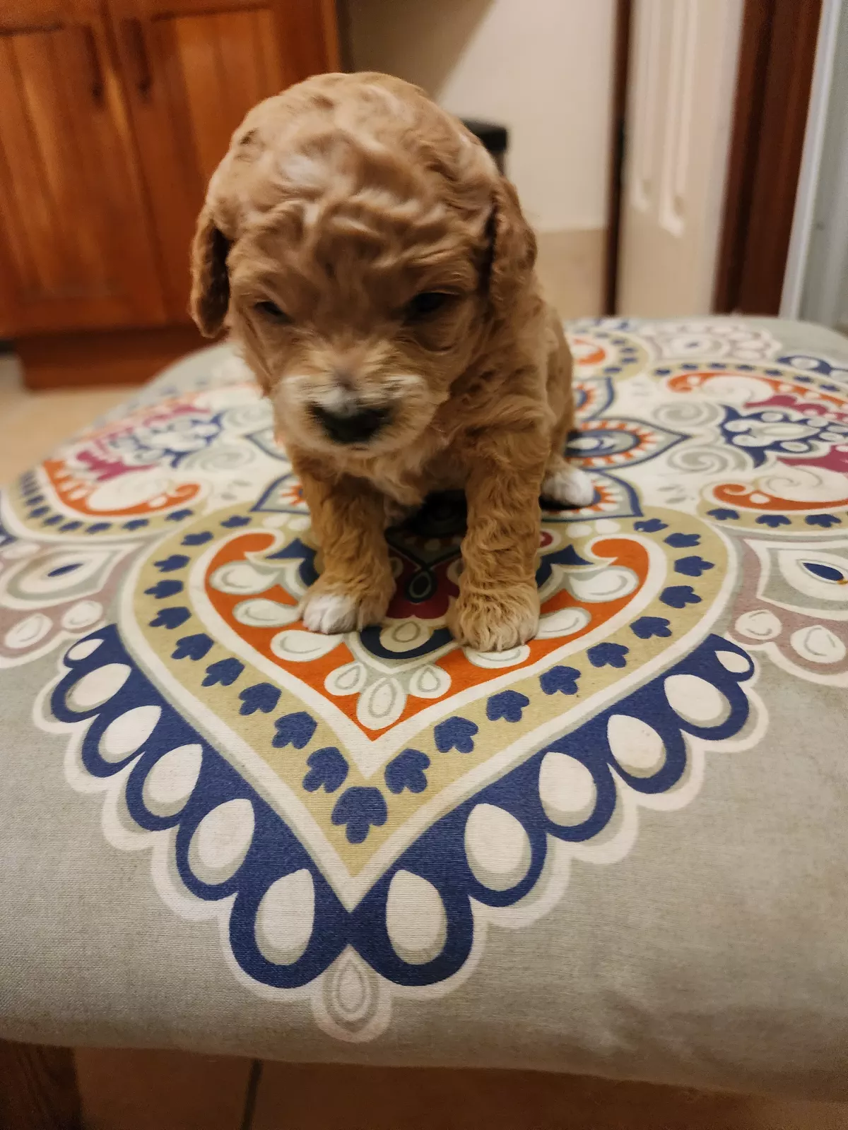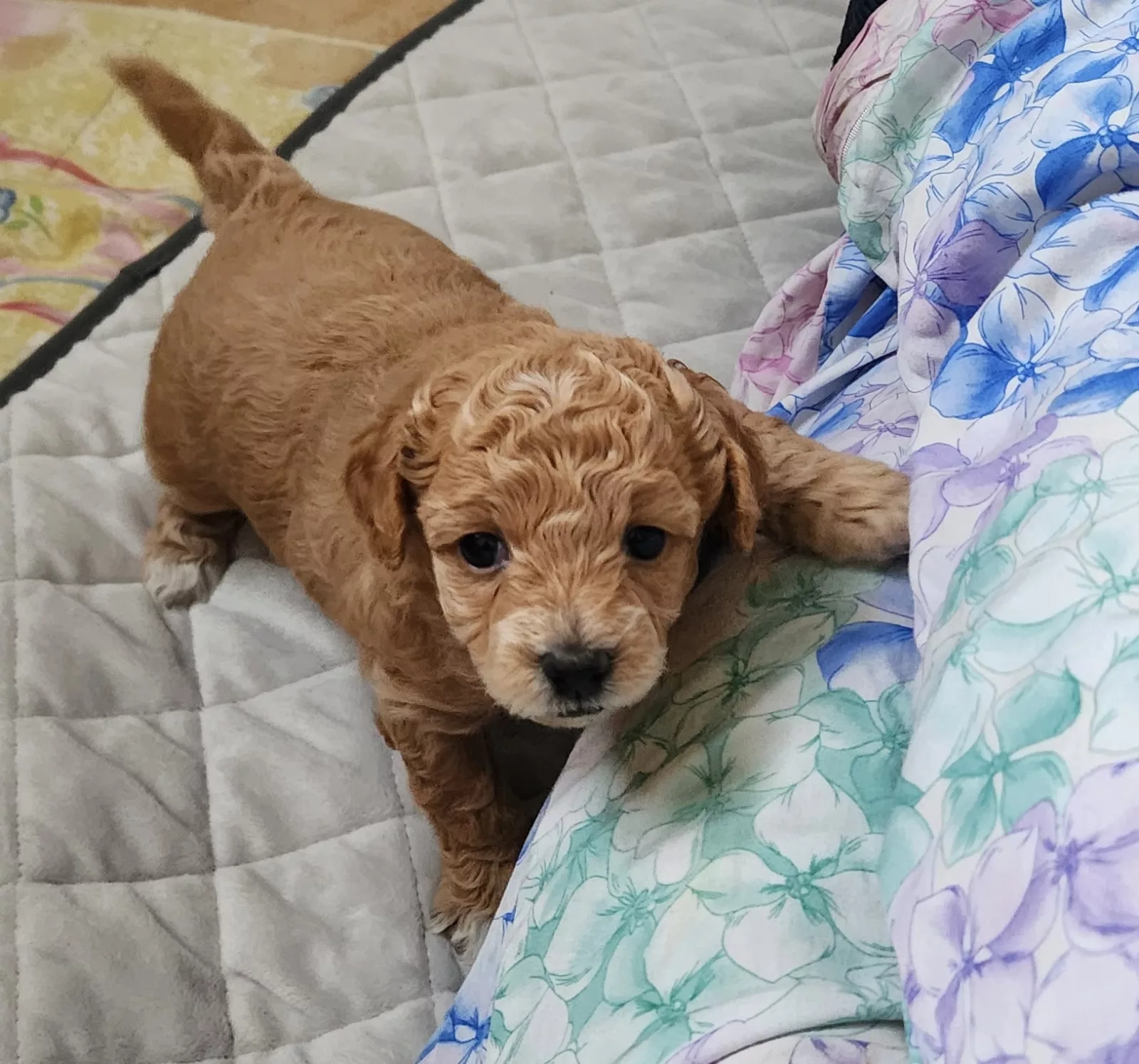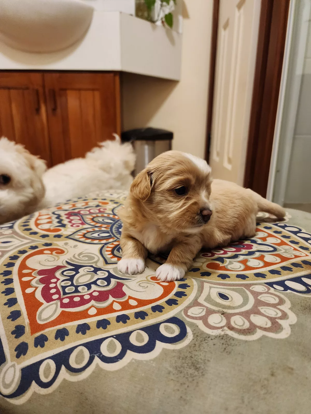 Amber our 2.5 year old Bichon (cross) mated with Blaise a chocolate coloured Toy Poodle 6/4 and she whelped 6 adorable puppies on Sunday June 9th. She had 4 girls and 2 boys. Four of the puppies are spoken for, however 2 beautiful girls remain. All of the puppies are thriving and already demonstrate calm and placid natures. They are 5 weeks old now and love a cuddle and scratch and are playful. They all enjoy just being held. Amber is a great mother and feeding them very well. They will be Vet checked and vaccinated and microchipped in 1-2 weeks time