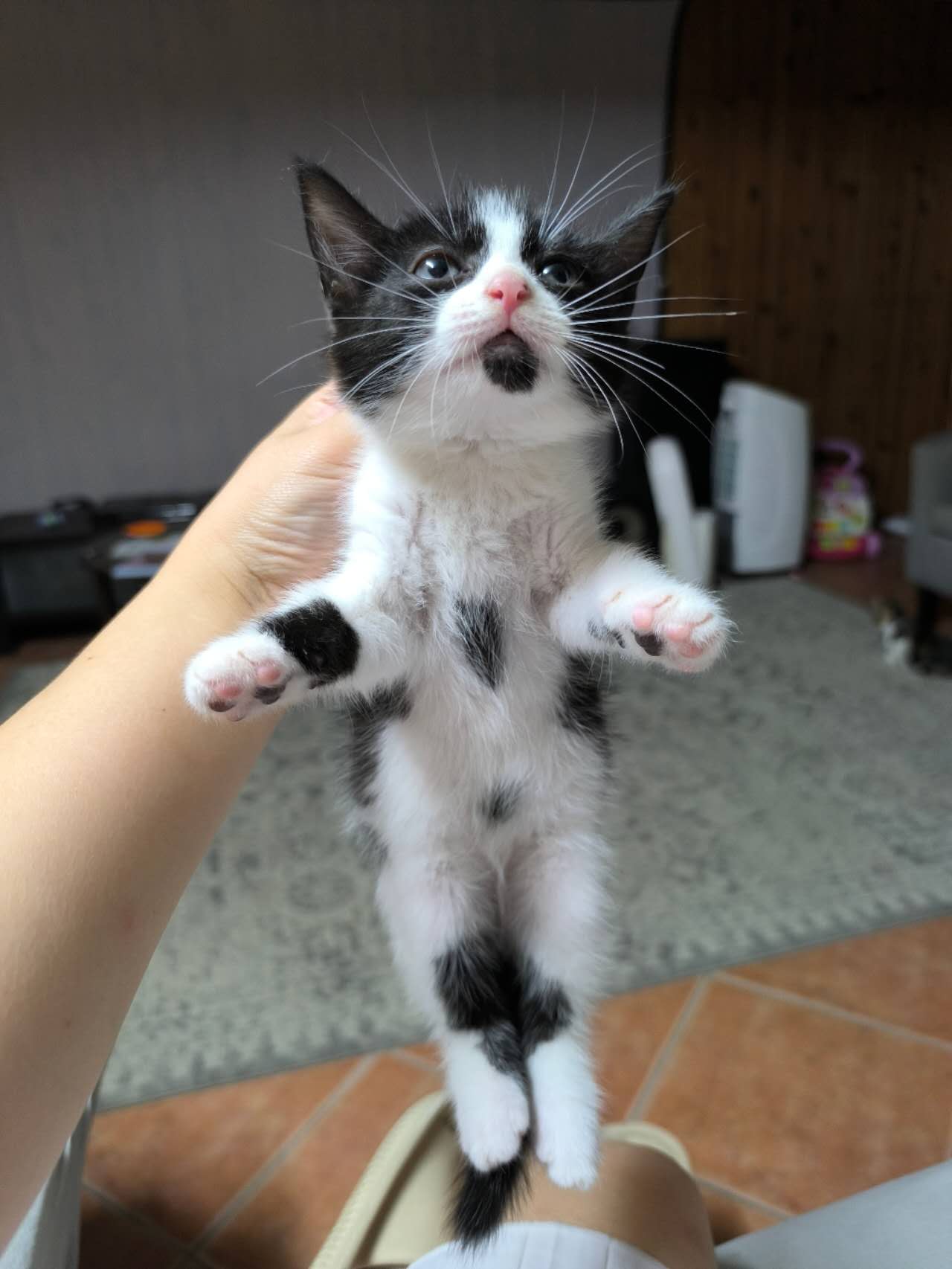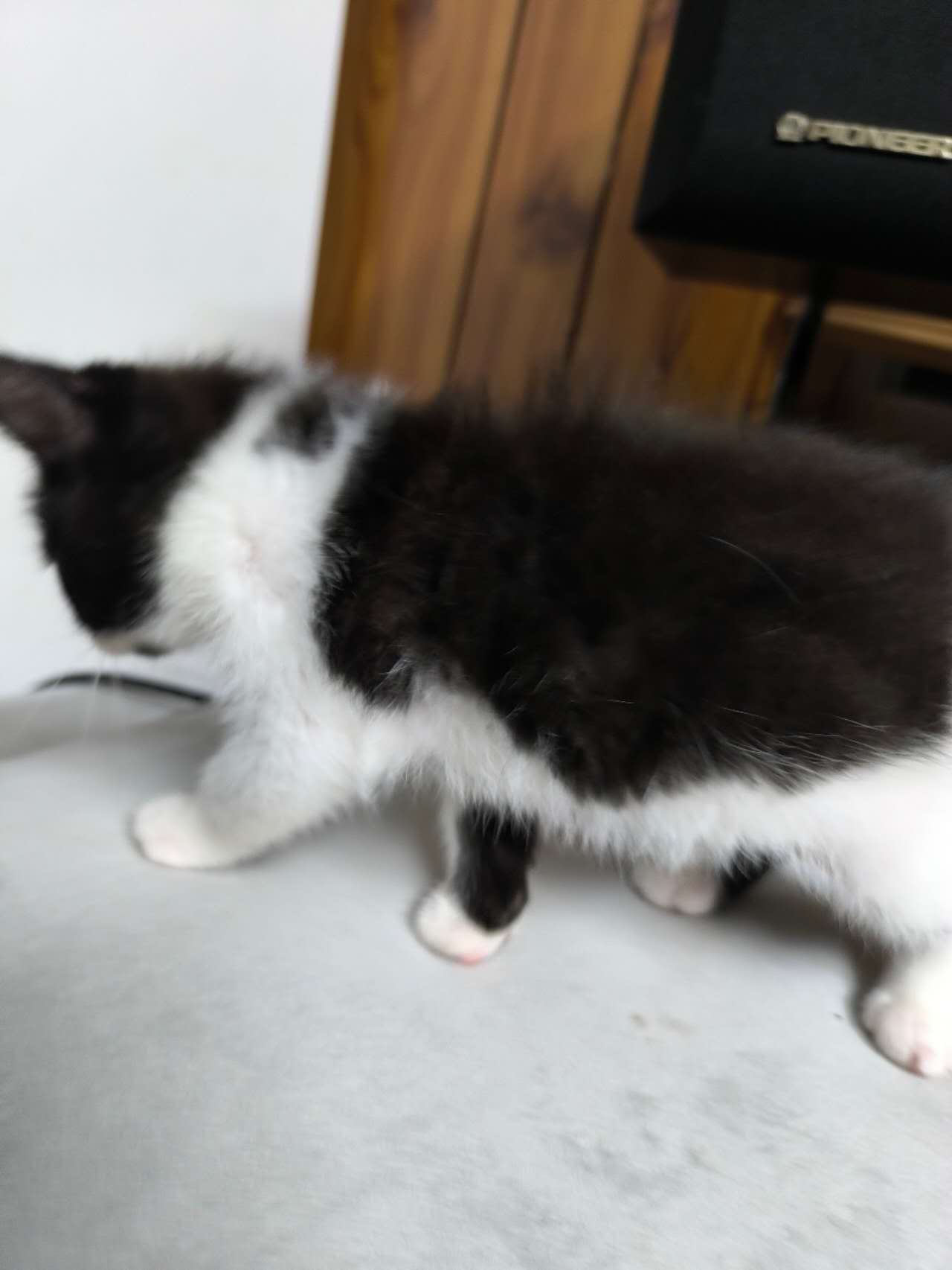 Features: A playful, curious, and sweet girl with unique black and white markings. Short/medium coat, very engaging.
