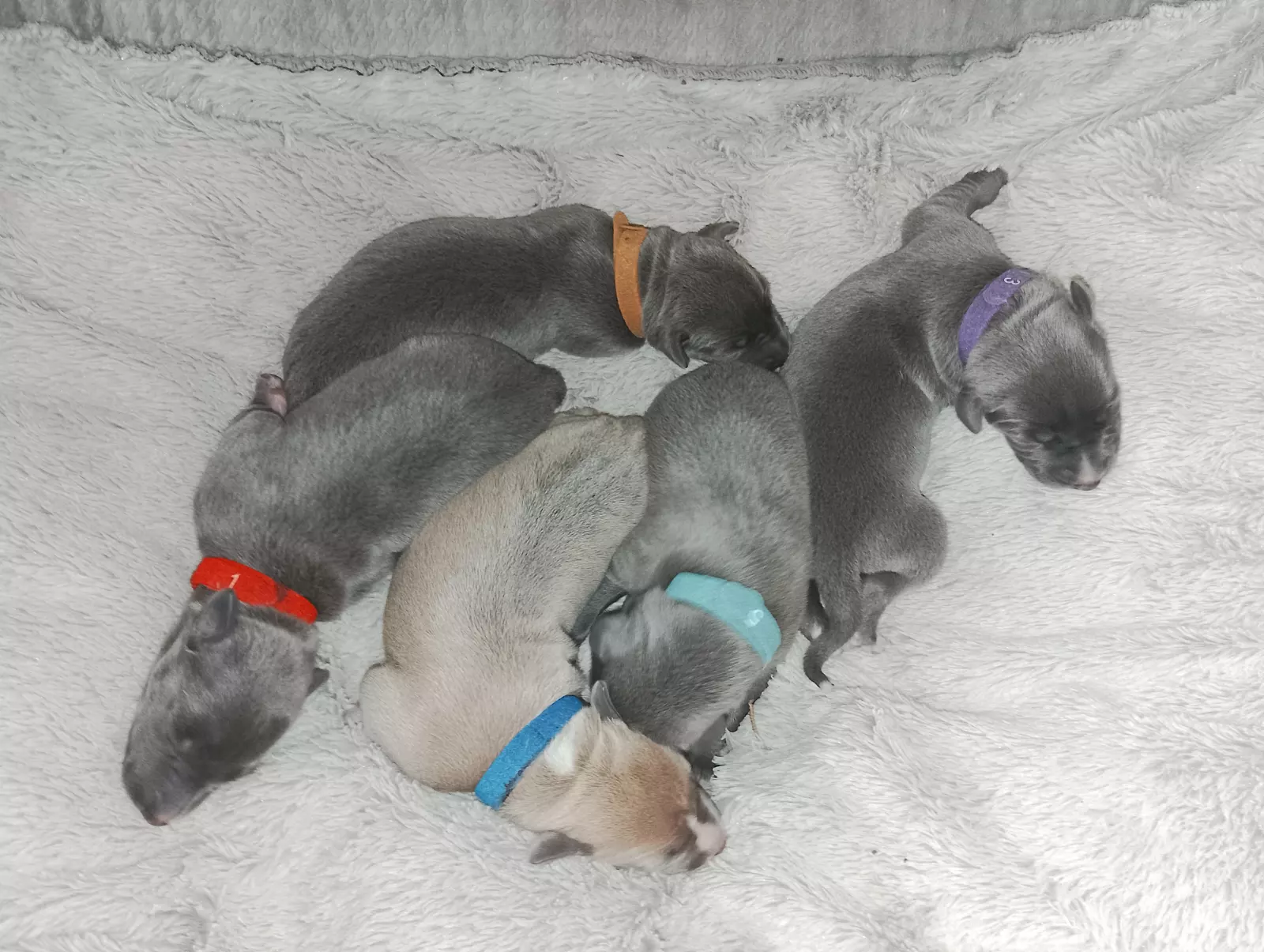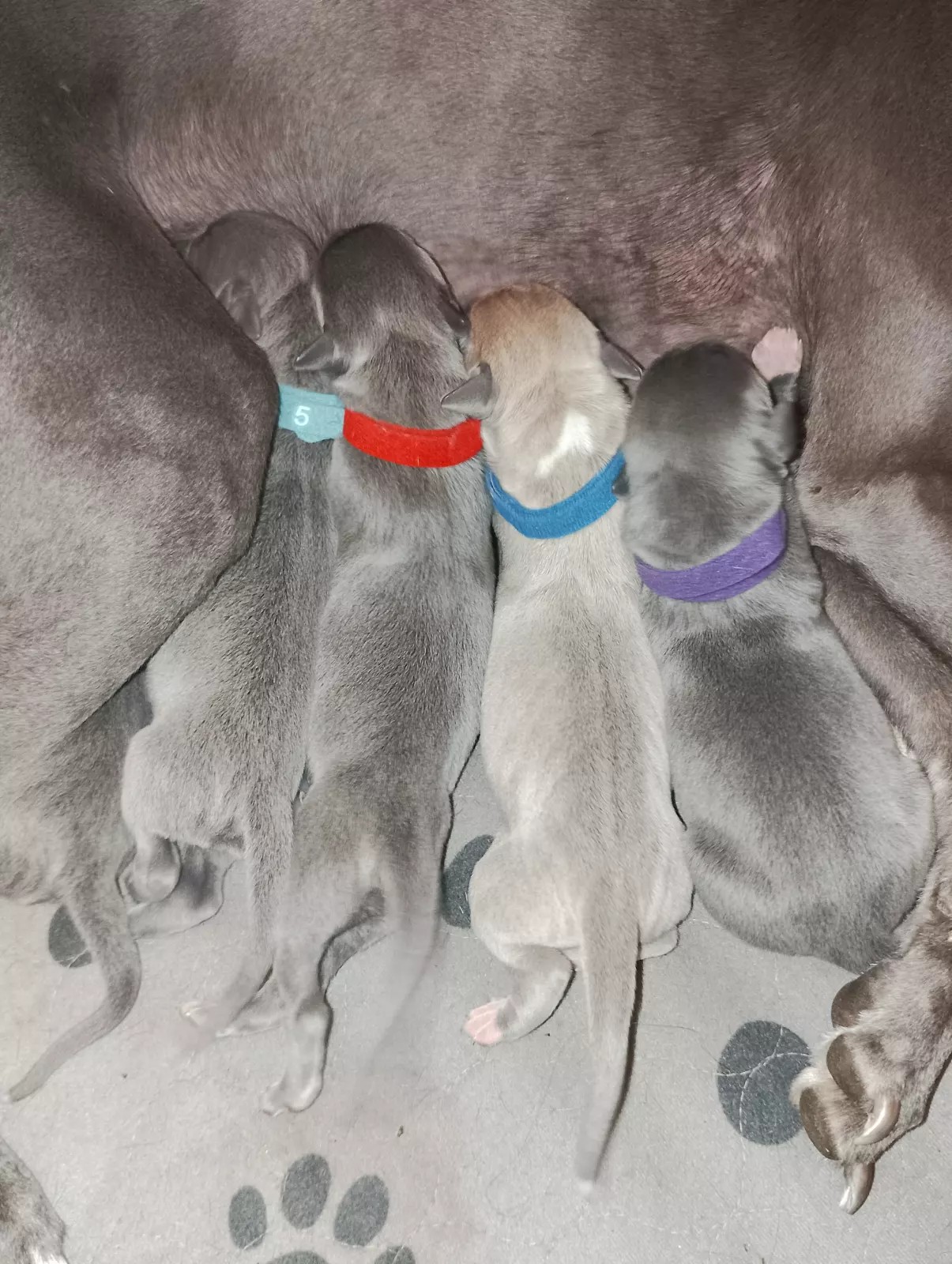 3 blue males - purple collar (4 white paws); Blue collar (white stripe on nose); Brown collar (blue all over)