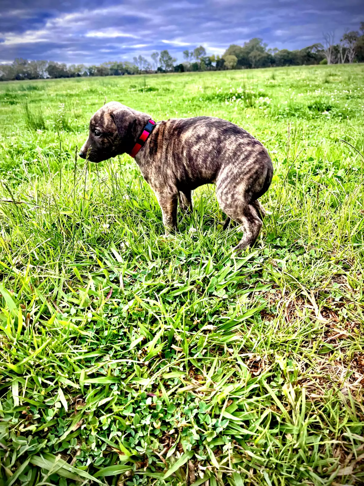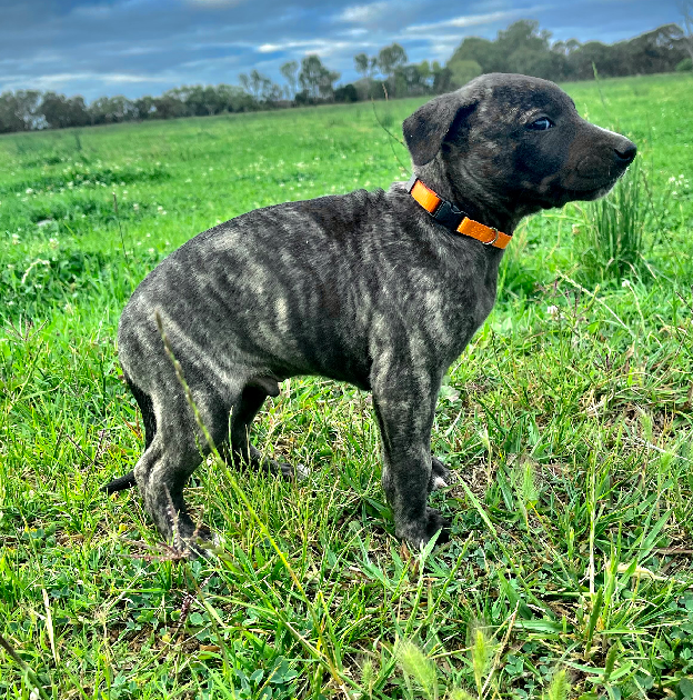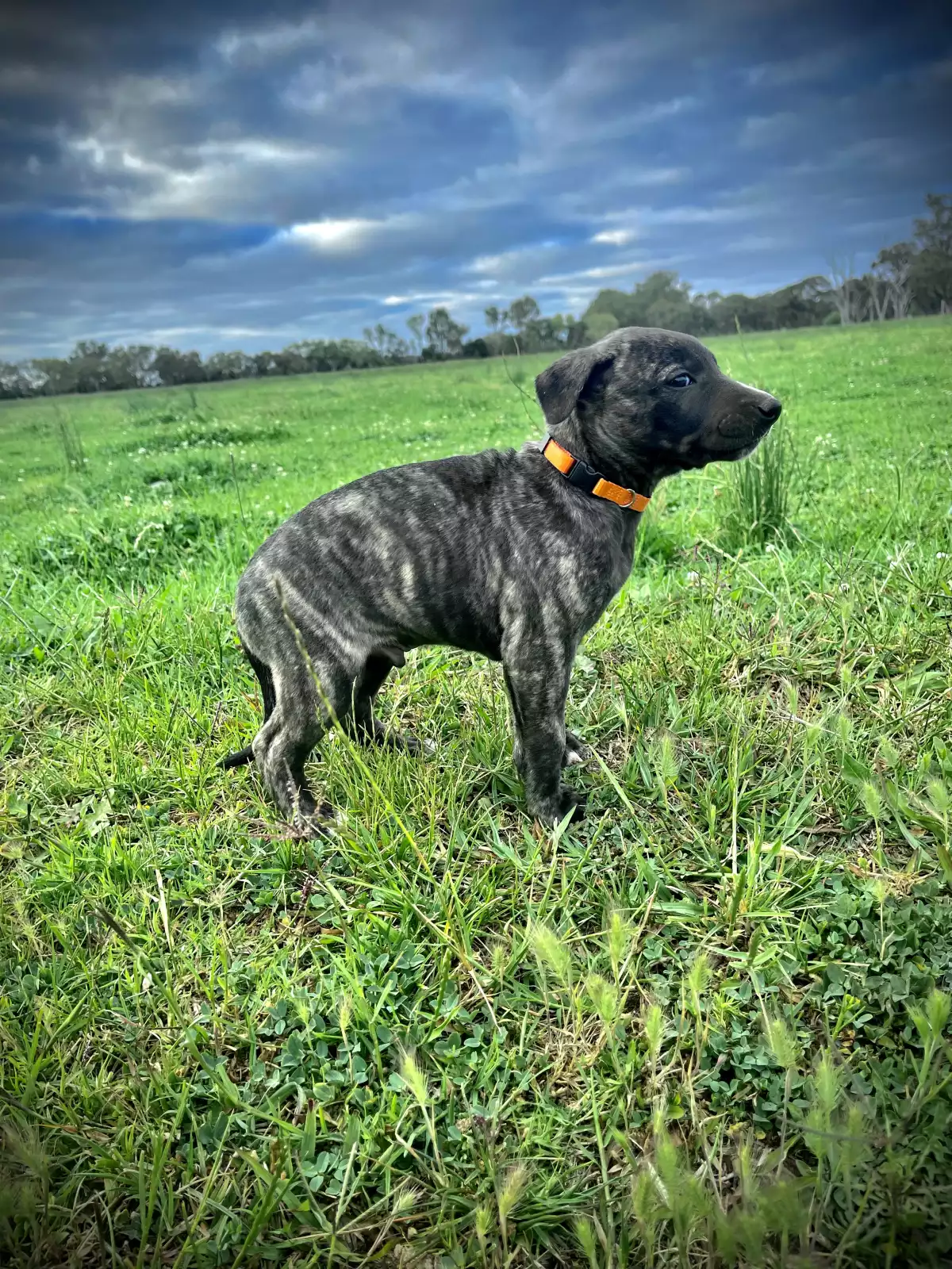 • Colour/Markings: Brown brindle with a small white dot under chin