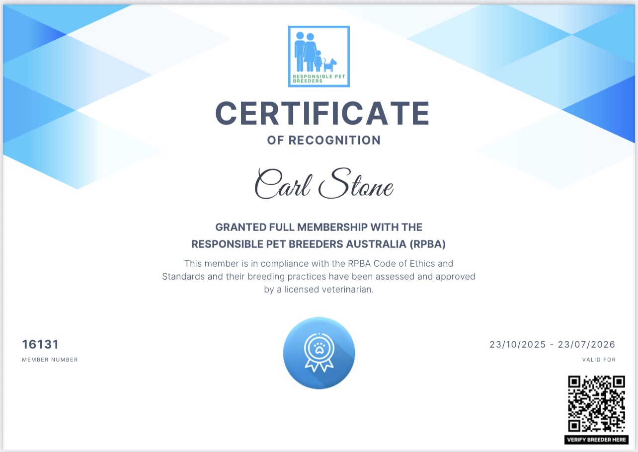 As a Responsible Pet Breeders Australia (RPBA) member (#16131), I follow strict breeding standards, including annual vet audits to ensure the highest level of care.